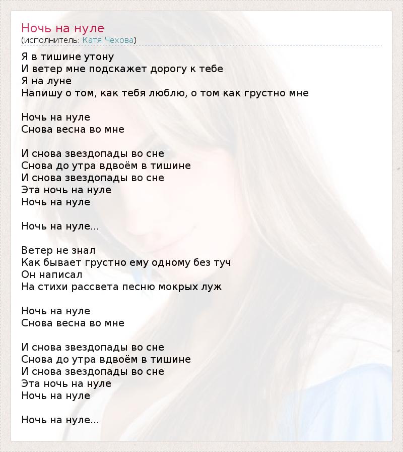 Я в тишине утону И ветер мне подскажет дорогу к тебе Я на луне Напишу о том, как тебя люблю, о том как грустно мне Ночь на нуле Снова весна во мне И снова звездопады во сне Снова до утра вдвоём в тишине И снова звездопады во сне Эта ночь на нуле Ночь на нуле Ночь на нуле... Ветер не знал Как бывает грустно ему одному без туч Он написал На стихи рассвета песню мокрых луж Ночь на нуле Снова весна во мне И снова звездопады во сне Снова до утра вдвоём в тишине И снова звездопады во сне Эта ночь на нуле Ночь на нуле Ночь на нуле...