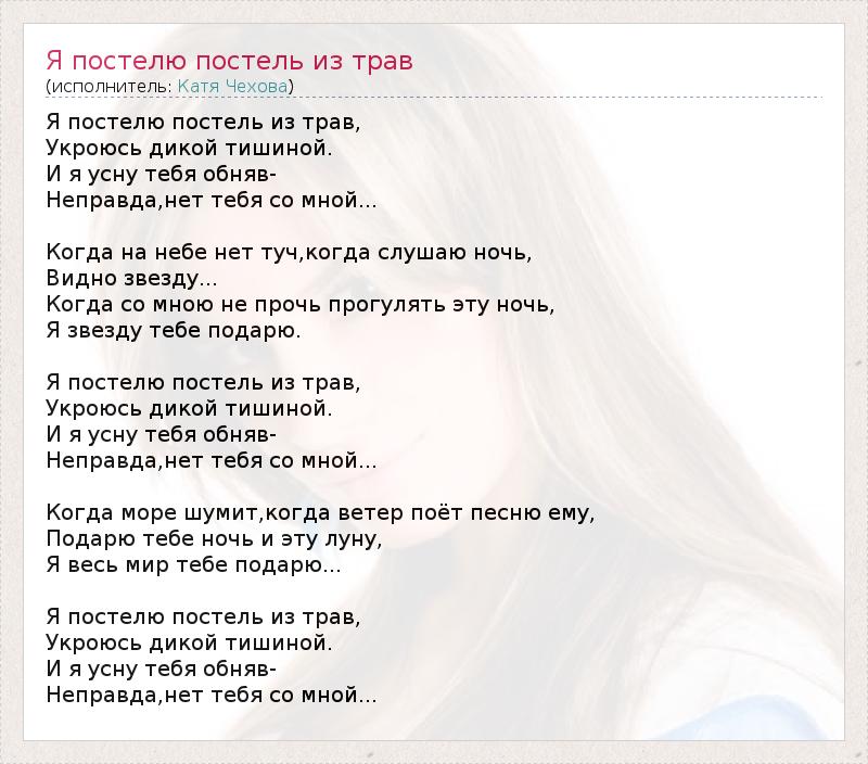 ГлавнаяИсполнителиКатя ЧеховаЯ постелю постель из трав