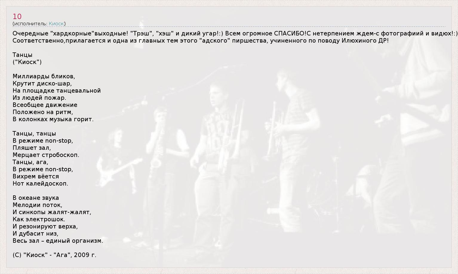 Regular & quot; hard-core & quot; weekend! & quot; Trash & quot ;, & quot; hash & quot; and wild frenzy! :) thank you all! We are looking forward, with photos and vidyuhi! :) Accordingly, the attached and one of the main themes of this & quot; hell & quot; feasting committed by about Ilyukhin DR! Dancing (& quot; Box & quot;) Billions of glare, Twists disco ball, On the dance floor Of the people on fire. General movement It relies on rhythm, Columns music off. Dance, dance In the non-stop, Dancing hall, Flickering strobe. Dancing, yeah, In the non-stop, Whirlwind vёetsya Notes kaleidoscope. In the ocean of sound Melodies flow And syncopation sting, sting, As electric shocks. And resonate top, And bludgeons bottom, The entire room - a single organism. (C) & quot; Box & quot; - & Quot; Ah & quot ;, 2009
