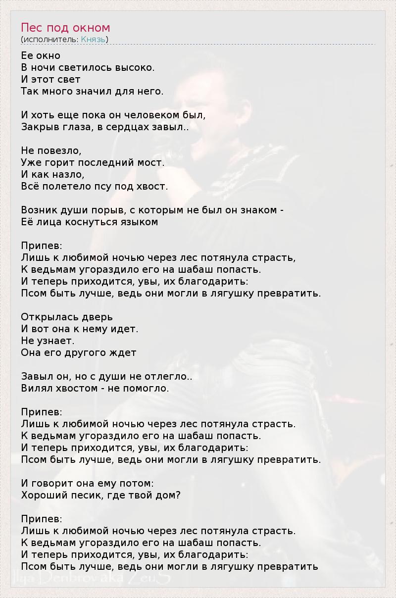 Ее окно В ночи светилось высоко. И этот свет Так много значил для него. И хоть еще пока он человеком был, Закрыв глаза, в сердцах завыл.. Не повезло, Уже горит последний мост. И как назло, Всё полетело псу под хвост. Возник души порыв, с которым не был он знаком - Её лица коснуться языком Припев: Лишь к любимой ночью через лес потянула страсть, К ведьмам угораздило его на шабаш попасть. И теперь приходится, увы, их благодарить: Псом быть лучше, ведь они могли в лягушку превратить. Открылась дверь И вот она к нему идет. Не узнает. Она его другого ждет Завыл он, но с души не отлегло.. Вилял хвостом - не помогло. Припев: Лишь к любимой ночью через лес потянула страсть. К ведьмам угораздило его на шабаш попасть. И теперь приходится, увы, их благодарить: Псом быть лучше, ведь они могли в лягушку превратить. И говорит она ему потом: Хороший песик, где твой дом? Припев: Лишь к любимой ночью через лес потянула страсть. К ведьмам угораздило его на шабаш попасть. И теперь приходится, увы, их благодарить: Псом быть лучше, ведь они могли в лягушку превратить