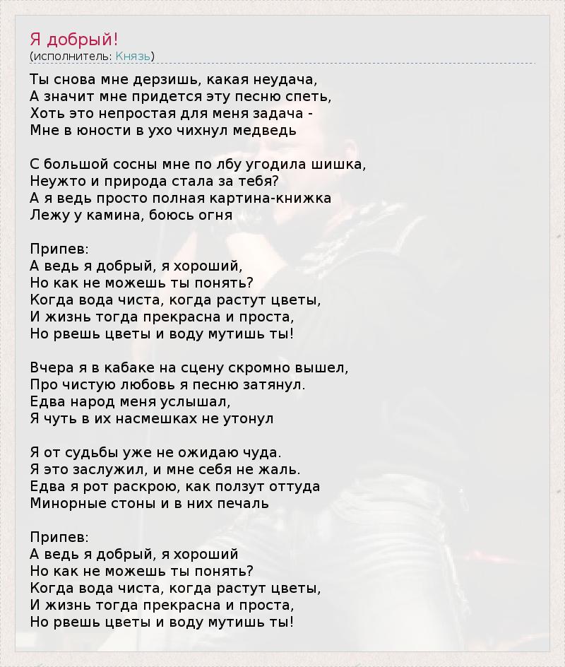 Ты снова мне дерзишь, какая неудача, А значит мне придется эту песню спеть, Хоть это непростая для меня задача - Мне в юности в ухо чихнул медведь С большой сосны мне по лбу угодила шишка, Неужто и природа стала за тебя? А я ведь просто полная картина-книжка Лежу у камина, боюсь огня Припев: А ведь я добрый, я хороший, Но как не можешь ты понять? Когда вода чиста, когда растут цветы, И жизнь тогда прекрасна и проста, Но рвешь цветы и воду мутишь ты! Вчера я в кабаке на сцену скромно вышел, Про чистую любовь я песню затянул. Едва народ меня услышал, Я чуть в их насмешках не утонул Я от судьбы уже не ожидаю чуда. Я это заслужил, и мне себя не жаль. Едва я рот раскрою, как ползут оттуда Минорные стоны и в них печаль Припев: А ведь я добрый, я хороший Но как не можешь ты понять? Когда вода чиста, когда растут цветы, И жизнь тогда прекрасна и проста, Но рвешь цветы и воду мутишь ты!