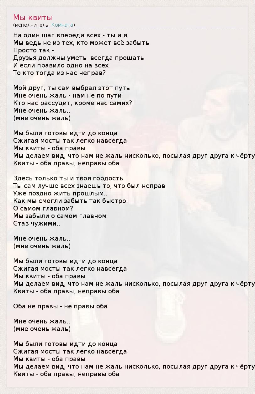 На один шаг впереди всех - ты и я Мы ведь не из тех, кто может всё забыть Просто так - Друзья должны уметь всегда прощать И если правило одно на всех То кто тогда из нас неправ? Мой друг, ты сам выбрал этот путь Мне очень жаль - нам не по пути Кто нас рассудит, кроме нас самих? Мне очень жаль.. (мне очень жаль) Мы были готовы идти до конца Сжигая мосты так легко навсегда Мы квиты - оба правы Мы делаем вид, что нам не жаль нисколько, посылая друг друга к чёрту Квиты - оба правы, неправы оба Здесь только ты и твоя гордость Ты сам лучше всех знаешь то, что был неправ Уже поздно жить прошлым.. Как мы смогли забыть так быстро О самом главном? Мы забыли о самом главном Став чужими.. Мне очень жаль.. (мне очень жаль) Мы были готовы идти до конца Сжигая мосты так легко навсегда Мы квиты - оба правы Мы делаем вид, что нам не жаль нисколько, посылая друг друга к чёрту Квиты - оба правы, неправы оба Оба не правы - не правы оба Мне очень жаль.. (мне очень жаль) Мы были готовы идти до конца Сжигая мосты так легко навсегда Мы квиты - оба правы Мы делаем вид, что нам не жаль нисколько, посылая друг друга к чёрту Квиты - оба правы, неправы оба