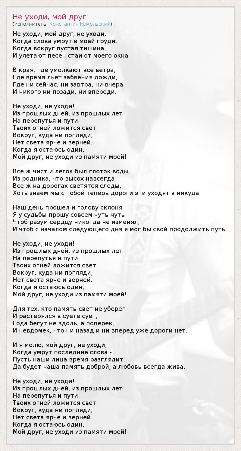 Не уходи, мой друг, не уходи, Когда слова умрут в моей груди. Когда вокруг пустая тишина, И улетают песен стаи от моего окна В края, где умолкают все ветра, Где время льет забвения дожди, Где ни сейчас, ни завтра, ни вчера И никого ни позади, ни впереди. Не уходи, не уходи! Из прошлых дней, из прошлых лет На перепутья и пути Твоих огней ложится свет. Вокруг, куда ни погляди, Нет света ярче и верней. Когда я остаюсь один, Мой друг, не уходи из памяти моей! Все ж чист и легок был глоток воды Из родника, что высох навсегда Все ж на дорогах светятся следы, Хоть знаем мы с тобой теперь дороги эти уходят в никуда. Наш день прошел и голову склоня Я у судьбы прошу совсем чуть-чуть - Чтоб разум сердцу никогда не изменял, И чтоб с началом следующего дня я мог бы свой продолжить путь. Не уходи, не уходи! Из прошлых дней, из прошлых лет На перепутья и пути Твоих огней ложится свет. Вокруг, куда ни погляди, Нет света ярче и верней. Когда я остаюсь один, Мой друг, не уходи из памяти моей! Для тех, кто память-свет не уберег И растерялся в суете сует, Года бегут не вдоль, а поперек, И невдомек, что ни назад и ни вперед уже дороги нет. И я молю, мой друг, не уходи, Когда умрут последние слова - Пусть наши лица время разглядит, Да будет наша память доброй, а любовь всегда жива. Не уходи, не уходи! Из прошлых дней, из прошлых лет На перепутья и пути Твоих огней ложится свет. Вокруг, куда ни погляди, Нет света ярче и верней. Когда я остаюсь один, Мой друг, не уходи из памяти моей!