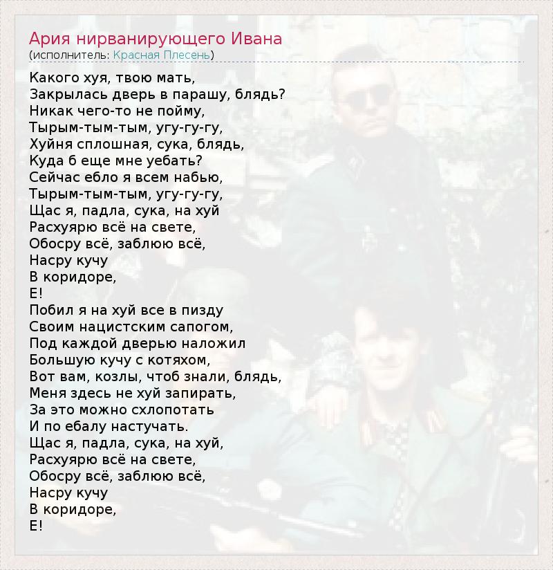 Какого хуя, твою мать, Закрылась дверь в парашу, блядь? Никак чего-то не пойму, Тырым-тым-тым, угу-гу-гу, Хуйня сплошная, сука, блядь, Куда б еще мне уебать? Сейчас ебло я всем набью, Тырым-тым-тым, угу-гу-гу, Щас я, падла, сука, на хуй Расхуярю всё на свете, Обосру всё, заблюю всё, Насру кучу В коридоре, Е! Побил я на хуй все в пизду Своим нацистским сапогом, Под каждой дверью наложил Большую кучу с котяхом, Вот вам, козлы, чтоб знали, блядь, Меня здесь не хуй запирать, За это можно схлопотать И по ебалу настучать. Щас я, падла, сука, на хуй, Расхуярю всё на свете, Обосру всё, заблюю всё, Насру кучу В коридоре, Е!