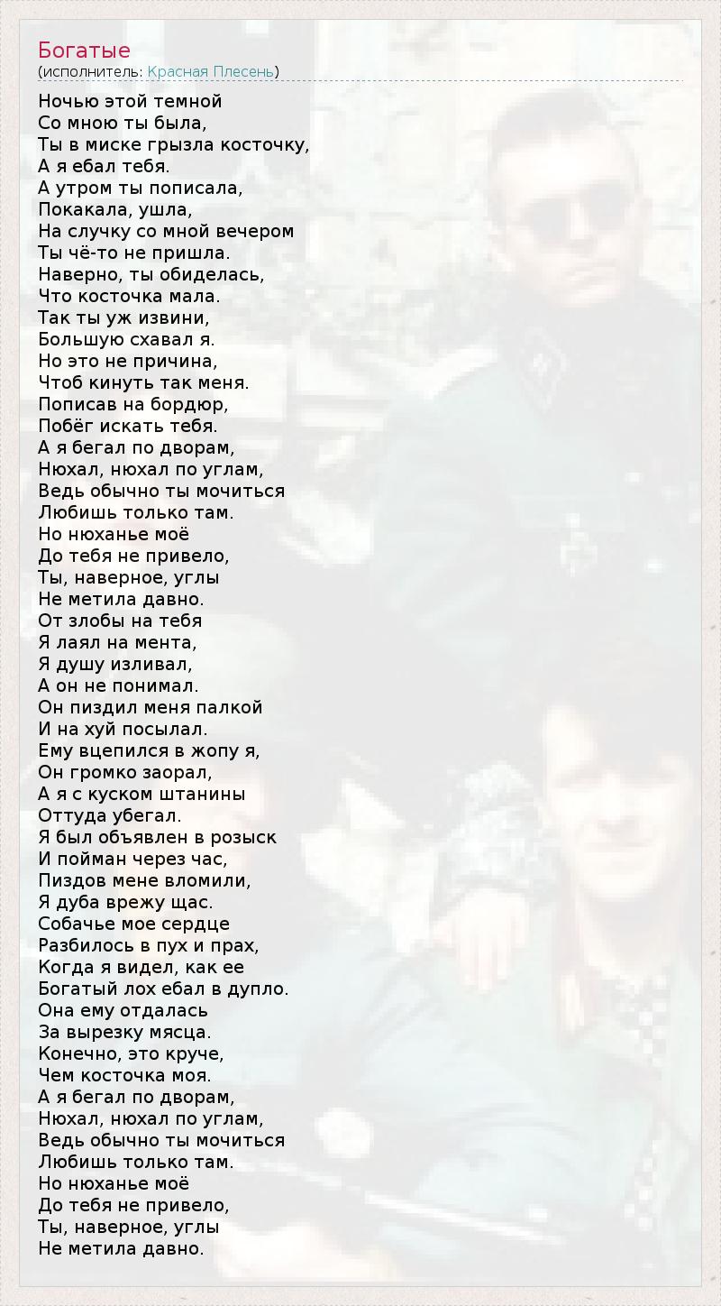 Ночью этой темной Со мною ты была, Ты в миске грызла косточку, А я ебал тебя. А утром ты пописала, Покакала, ушла, На случку со мной вечером Ты чё-то не пришла. Наверно, ты обиделась, Что косточка мала. Так ты уж извини, Большую схавал я. Но это не причина, Чтоб кинуть так меня. Пописав на бордюр, Побёг искать тебя. А я бегал по дворам, Нюхал, нюхал по углам, Ведь обычно ты мочиться Любишь только там. Но нюханье моё До тебя не привело, Ты, наверное, углы Не метила давно. От злобы на тебя Я лаял на мента, Я душу изливал, А он не понимал. Он пиздил меня палкой И на хуй посылал. Ему вцепился в жопу я, Он громко заорал, А я с куском штанины Оттуда убегал. Я был объявлен в розыск И пойман через час, Пиздов мене вломили, Я дуба врежу щас. Собачье мое сердце Разбилось в пух и прах, Когда я видел, как ее Богатый лох ебал в дупло. Она ему отдалась За вырезку мясца. Конечно, это круче, Чем косточка моя. А я бегал по дворам, Нюхал, нюхал по углам, Ведь обычно ты мочиться Любишь только там. Но нюханье моё До тебя не привело, Ты, наверное, углы Не метила давно.
