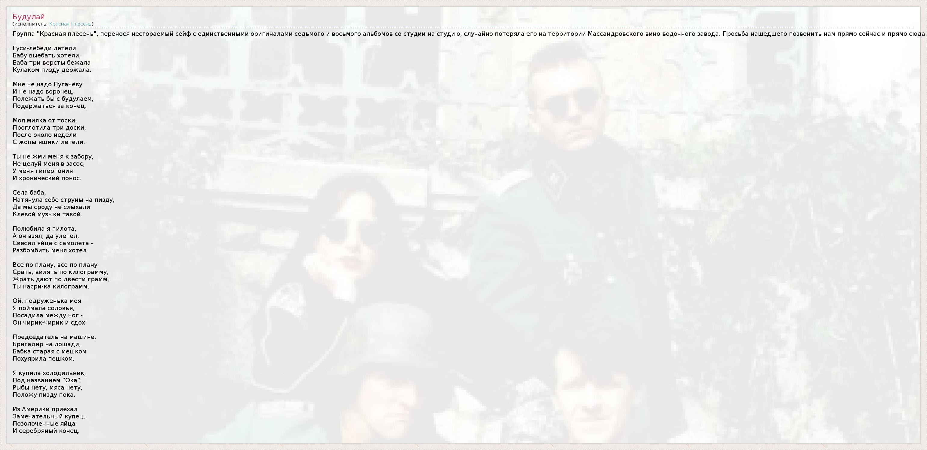 Группа "Красная плесень", перенося несгораемый сейф с единственными оригиналами седьмого и восьмого альбомов со студии на студию, случайно потеряла его на территории Массандровского вино-водочного завода. Просьба нашедшего позвонить нам прямо сейчас и прямо сюда. Гуси-лебеди летели Бабу выебать хотели, Баба три версты бежала Кулаком пизду держала. Мне не надо Пугачёву И не надо воронец, Полежать бы с будулаем, Подержаться за конец. Моя милка от тоски, Проглотила три доски, После около недели С жопы ящики летели. Ты не жми меня к забору, Не целуй меня в засос, У меня гипертония И хронический понос. Села баба, Натянула себе струны на пизду, Да мы сроду не слыхали Клёвой музыки такой. Полюбила я пилота, А он взял, да улетел, Свесил яйца с самолета - Разбомбить меня хотел. Все по плану, все по плану Срать, вилять по килограмму, Жрать дают по двести грамм, Ты насри-ка килограмм. Ой, подруженька моя Я поймала соловья, Посадила между ног - Он чирик-чирик и сдох. Председатель на машине, Бригадир на лошади, Бабка старая с мешком Похуярила пешком. Я купила холодильник, Под названием "Ока". Рыбы нету, мяса нету, Положу пизду пока. Из Америки приехал Замечательный купец, Позолоченные яйца И серебряный конец.