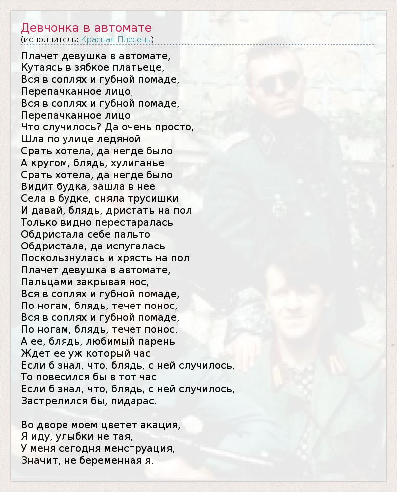 Плачет девушка в автомате, Кутаясь в зябкое платьеце, Вся в соплях и губной помаде, Перепачканное лицо, Вся в соплях и губной помаде, Перепачканное лицо. Что случилось? Да очень просто, Шла по улице ледяной Срать хотела, да негде было А кругом, блядь, хулиганье Срать хотела, да негде было Видит будка, зашла в нее Села в будке, сняла трусишки И давай, блядь, дристать на пол Только видно перестаралась Обдристала себе пальто Обдристала, да испугалась Поскользнулась и хрясть на пол Плачет девушка в автомате, Пальцами закрывая нос, Вся в соплях и губной помаде, По ногам, блядь, течет понос, Вся в соплях и губной помаде, По ногам, блядь, течет понос. А ее, блядь, любимый парень Ждет ее уж который час Если б знал, что, блядь, с ней случилось, То повесился бы в тот час Если б знал, что, блядь, с ней случилось, Застрелился бы, пидарас. Во дворе моем цветет акация, Я иду, улыбки не тая, У меня сегодня менструация, Значит, не беременная я.