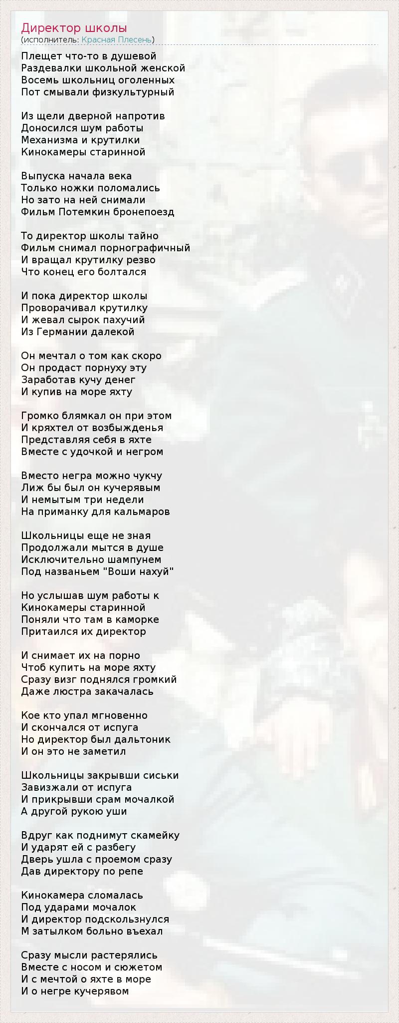 Это интересно:«Красная Плесень» — русская sovietcore группа из Симферополя, основанная Павлом Яцыной в 1989 году, которая известна пародированием известных песен российских и иностранных исполнителей и групп, а также исполнением собственных композиций . 15 альбомов из серии «СОЮЗ популярных пародий», 9 пародийных сказок и более двадцати песенных тяжелых sovietcore-альбомов и сборников.8 параллельных проектов.... продолжение