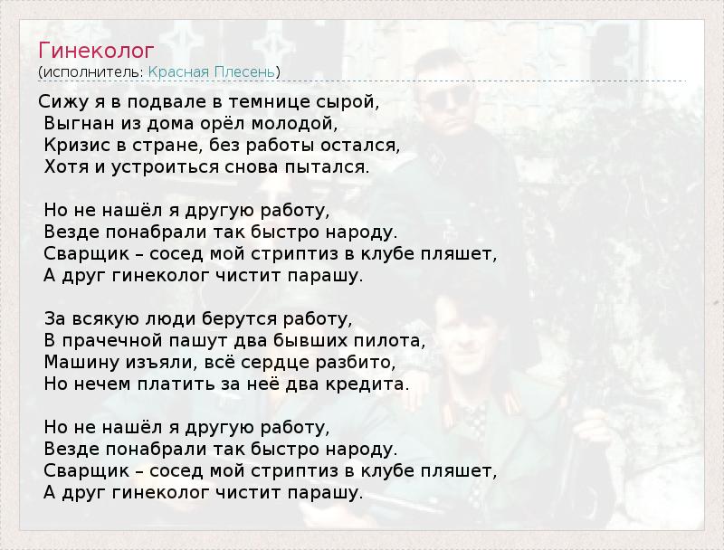 Сижу я в подвале в темнице сырой, Выгнан из дома орёл молодой, Кризис в стране, без работы остался, Хотя и устроиться снова пытался. Но не нашёл я другую работу, Везде понабрали так быстро народу. Сварщик – сосед мой стриптиз в клубе пляшет, А друг гинеколог чистит парашу. За всякую люди берутся работу, В прачечной пашут два бывших пилота, Машину изъяли, всё сердце разбито, Но нечем платить за неё два кредита. Но не нашёл я другую работу, Везде понабрали так быстро народу. Сварщик – сосед мой стриптиз в клубе пляшет, А друг гинеколог чистит парашу.