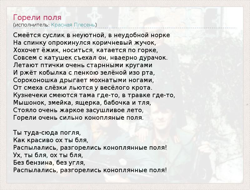 Это интересно:«Красная Плесень» — русская sovietcore группа из Симферополя, основанная Павлом Яцыной в 1989 году, которая известна пародированием известных песен российских и иностранных исполнителей и групп, а также исполнением собственных композиций . 15 альбомов из серии «СОЮЗ популярных пародий», 9 пародийных сказок и более двадцати песенных тяжелых sovietcore-альбомов и сборников.8 параллельных проектов.... продолжение