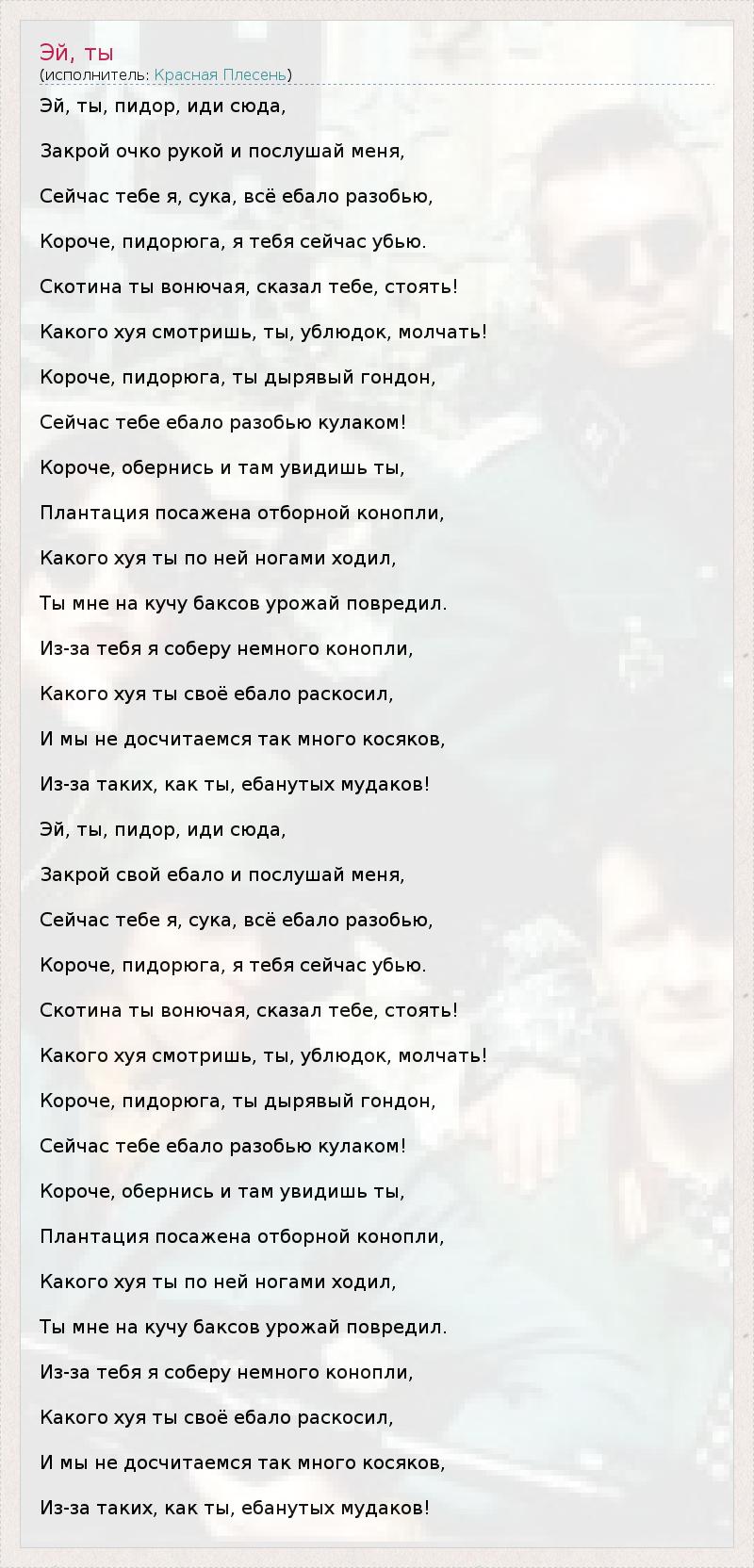 Эй, ты, пидор, иди сюда, Закрой очко рукой и послушай меня, Сейчас тебе я, сука, всё ебало разобью, Короче, пидорюга, я тебя сейчас убью. Скотина ты вонючая, сказал тебе, стоять! Какого хуя смотришь, ты, ублюдок, молчать! Короче, пидорюга, ты дырявый гондон, Сейчас тебе ебало разобью кулаком! Короче, обернись и там увидишь ты, Плантация посажена отборной конопли, Какого хуя ты по ней ногами ходил, Ты мне на кучу баксов урожай повредил. Из-за тебя я соберу немного конопли, Какого хуя ты своё ебало раскосил, И мы не досчитаемся так много косяков, Из-за таких, как ты, ебанутых мудаков! Эй, ты, пидор, иди сюда, Закрой свой ебало и послушай меня, Сейчас тебе я, сука, всё ебало разобью, Короче, пидорюга, я тебя сейчас убью. Скотина ты вонючая, сказал тебе, стоять! Какого хуя смотришь, ты, ублюдок, молчать! Короче, пидорюга, ты дырявый гондон, Сейчас тебе ебало разобью кулаком! Короче, обернись и там увидишь ты, Плантация посажена отборной конопли, Какого хуя ты по ней ногами ходил, Ты мне на кучу баксов урожай повредил. Из-за тебя я соберу немного конопли, Какого хуя ты своё ебало раскосил, И мы не досчитаемся так много косяков, Из-за таких, как ты, ебанутых мудаков!