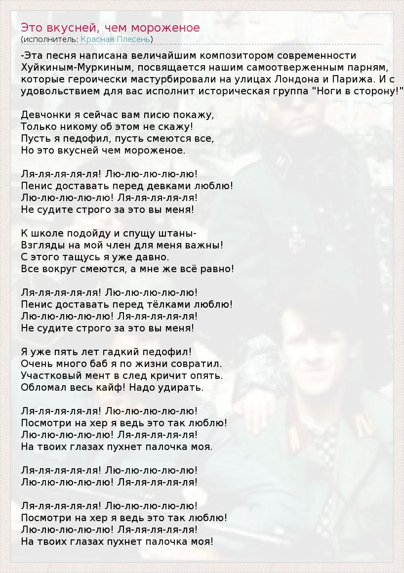 -This Song is the greatest composer of our time Huykinym - Murkin , our dedicated selfless guys who heroically masturbated on the streets of London and Paris. And with happy for you perform a historical group & quot; legs apart ! & quot; The girls I'm going to show you a pussy , Just about anyone about this I will not tell ! I let a pedophile , even laughing all But it's tastier than ice cream. La-la- la-la -la! Lu -lu -lu -lu -lu ! Penis to get the girls to love ! Lu -lu -lu -lu -lu ! La-la- la-la -la! Do not judge strictly for it you got me ! Go up to the school and launched shtany- Views on my dick important to me ! Since then, I have long trudge . All around are laughing , and I also do not care ! La-la- la-la -la! Lu -lu -lu -lu -lu ! Penis to get chicks love ! Lu -lu -lu -lu -lu ! La-la- la-la -la! Do not judge strictly for it you got me ! I have five years disgusting pedophile ! A lot of the women I seduced by life . The policeman cop yells at the track again . Broke off all the buzz ! We must get away . La-la- la-la -la! Lu -lu -lu -lu -lu ! Look at the dick I'm so in love with it ! Lu -lu -lu -lu -lu ! La-la- la-la -la! Your eyes swells my wand . La-la- la-la -la! Lu -lu -lu -lu -lu ! Lu -lu -lu -lu -lu ! La-la- la-la -la! La-la- la-la -la! Lu -lu -lu -lu -lu ! Look at the dick I'm so in love with it ! Lu -lu -lu -lu -lu ! La-la- la-la -la! Your eyes swells my wand !