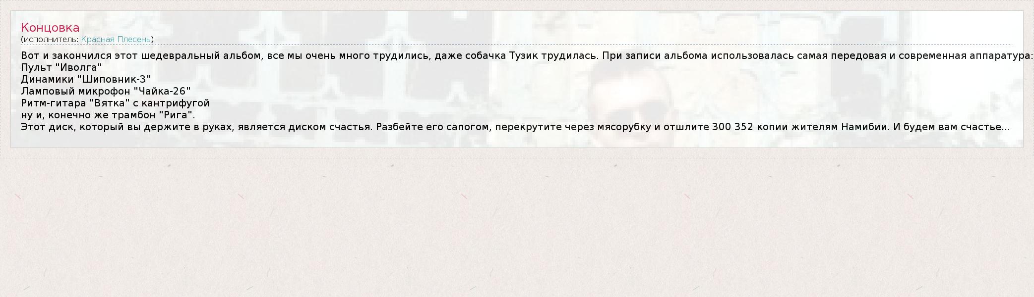 Вот и закончился этот шедевральный альбом, все мы очень много трудились, даже собачка Тузик трудилась. При записи альбома использовалась самая передовая и современная аппаратура: Пульт "Иволга" Динамики "Шиповник-3" Ламповый микрофон "Чайка-26" Ритм-гитара "Вятка" с кантрифугой ну и, конечно же трамбон "Рига". Этот диск, который вы держите в руках, является диском счастья. Разбейте его сапогом, перекрутите через мясорубку и отшлите 300 352 копии жителям Намибии. И будем вам счастье...