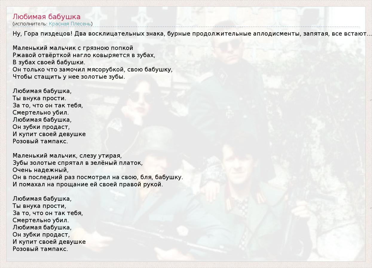 Ну, Гора пиздецов! Два восклицательных знака, бурные продолжительные аплодисменты, запятая, все встают... Маленький мальчик с грязною попкой Ржавой отвёрткой нагло ковыряется в зубах, В зубах своей бабушки. Он только что замочил мясорубкой, свою бабушку, Чтобы стащить у нее золотые зубы. Любимая бабушка, Ты внука прости. За то, что он так тебя, Смертельно убил. Любимая бабушка, Он зубки продаст, И купит своей девушке Розовый тампакс. Маленький мальчик, слезу утирая, Зубы золотые спрятал в зелёный платок, Очень надежный, Он в последний раз посмотрел на свою, бля, бабушку. И помахал на прощание ей своей правой рукой. Любимая бабушка, Ты внука прости, За то, что он так тебя, Смертельно убил. Любимая бабушка, Он зубки продаст, И купит своей девушке Розовый тампакс.