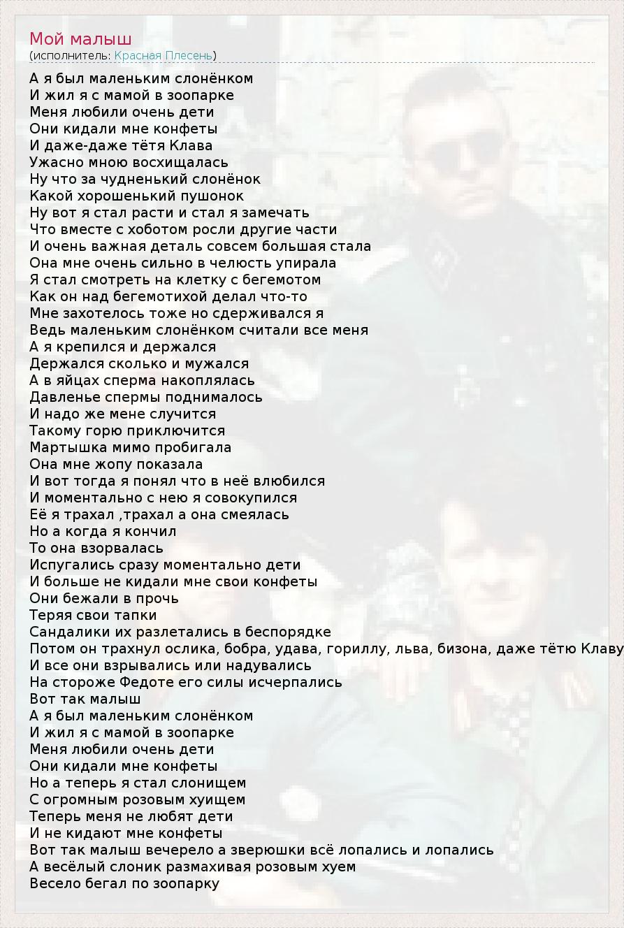 А я был маленьким слонёнком И жил я с мамой в зоопарке Меня любили очень дети Они кидали мне конфеты И даже-даже тётя Клава Ужасно мною восхищалась Ну что за чудненький слонёнок Какой хорошенький пушонок Ну вот я стал расти и стал я замечать Что вместе с хоботом росли другие части И очень важная деталь совсем большая стала Она мне очень сильно в челюсть упирала Я стал смотреть на клетку с бегемотом Как он над бегемотихой делал что-то Мне захотелось тоже но сдерживался я Ведь маленьким слонёнком считали все меня А я крепился и держался Держался сколько и мужался А в яйцах сперма накоплялась Давленье спермы поднималось И надо же мене случится Такому горю приключится Мартышка мимо пробигала Она мне жопу показала И вот тогда я понял что в неё влюбился И моментально с нею я совокупился Её я трахал ,трахал а она смеялась Но а когда я кончил То она взорвалась Испугались сразу моментально дети И больше не кидали мне свои конфеты Они бежали в прочь Теряя свои тапки Сандалики их разлетались в беспорядке Потом он трахнул ослика, бобра, удава, гориллу, льва, бизона, даже тётю Клаву И все они взрывались или надувались На стороже Федоте его силы исчерпались Вот так малыш А я был маленьким слонёнком И жил я с мамой в зоопарке Меня любили очень дети Они кидали мне конфеты Но а теперь я стал слонищем С огромным розовым хуищем Теперь меня не любят дети И не кидают мне конфеты Вот так малыш вечерело а зверюшки всё лопались и лопались А весёлый слоник размахивая розовым хуем Весело бегал по зоопарку