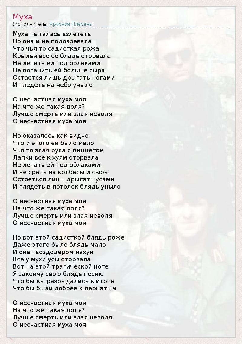 Муха пыталась взлететь Но она и не подозревала Что чья то садисткая рожа Крылья все ее бладь оторвала Не летать ей под облаками Не поганить ей больше сыра Остается лишь дрыгать ногами И гледеть на небо уныло О несчастная муха моя На что же такая доля? Лучше смерть или злая неволя О несчастная муха моя Но оказалось как видно Что и этого ей было мало Чья то злая рука с пинцетом Лапки все к хуям оторвала Не летать ей под облаками И не срать на колбасы и сыры Остоеться лишь дрыгать усами И глядеть в потолок блядь уныло О несчастная муха моя На что же такая доля? Лучше смерть или злая неволя О несчастная муха моя Но вот этой садисткой блядь роже Даже этого было блядь мало И она гвоздодером нахуй Все у мухи усы оторвала Вот на этой трагической ноте Я закончу свою блядь песню Что бы вы разрыдались в итоге Что бы были добрее к пернатым О несчастная муха моя На что же такая доля? Лучше смерть или злая неволя О несчастная муха моя