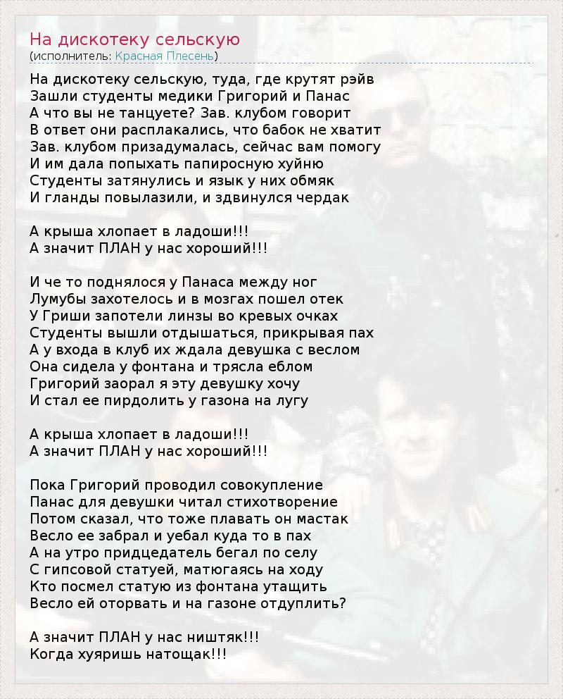 На дискотеку сельскую, туда, где крутят рэйв Зашли студенты медики Григорий и Панас А что вы не танцуете? Зав. клубом говорит В ответ они расплакались, что бабок не хватит Зав. клубом призадумалась, сейчас вам помогу И им дала попыхать папиросную хуйню Студенты затянулись и язык у них обмяк И гланды повылазили, и здвинулся чердак А крыша хлопает в ладоши!!! А значит ПЛАН у нас хороший!!! И че то поднялося у Панаса между ног Лумубы захотелось и в мозгах пошел отек У Гриши запотели линзы во кревых очках Студенты вышли отдышаться, прикрывая пах А у входа в клуб их ждала девушка с веслом Она сидела у фонтана и трясла еблом Григорий заорал я эту девушку хочу И стал ее пирдолить у газона на лугу А крыша хлопает в ладоши!!! А значит ПЛАН у нас хороший!!! Пока Григорий проводил совокупление Панас для девушки читал стихотворение Потом сказал, что тоже плавать он мастак Весло ее забрал и уебал куда то в пах А на утро придцедатель бегал по селу С гипсовой статуей, матюгаясь на ходу Кто посмел статую из фонтана утащить Весло ей оторвать и на газоне отдуплить? А значит ПЛАН у нас ништяк!!! Когда хуяришь натощак!!!