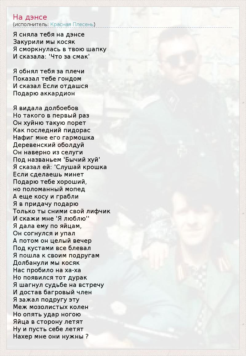 Я сняла тебя на дэнсе Закурили мы косяк Я сморкнулась в твою шапку И сказала: 'Что за смак' Я обнял тебя за плечи Показал тебе гондом И сказал Если отдашся Подарю аккардион Я видала долбоебов Но такого в первый раз Он хуйню такую порет Как последний пидорас Нафиг мне его гармошка Деревенский оболдуй Он наверно из селуги Под названьем 'Бычий хуй' Я сказал ей: 'Слушай крошка Если сделаешь минет Подарю тебе хороший, но поломанный мопед А еще косу и грабли Я в придачу подарю Только ты сними свой лифчик И скажи мне 'Я люблю'' Я дала ему по яйцам, Он согнулся и упал А потом он целый вечер Под кустами все блевал Я пошла к своим подругам Долбанули мы косяк Нас пробило на ха-ха Но появился тот дурак Я шагнул судьбе на встречу И достав багровый член Я зажал подругу эту Меж мозолистых колен Но опять удар ногою Яйца в сторону летят Ну и пусть себе летят Нахер мне они нужны ?