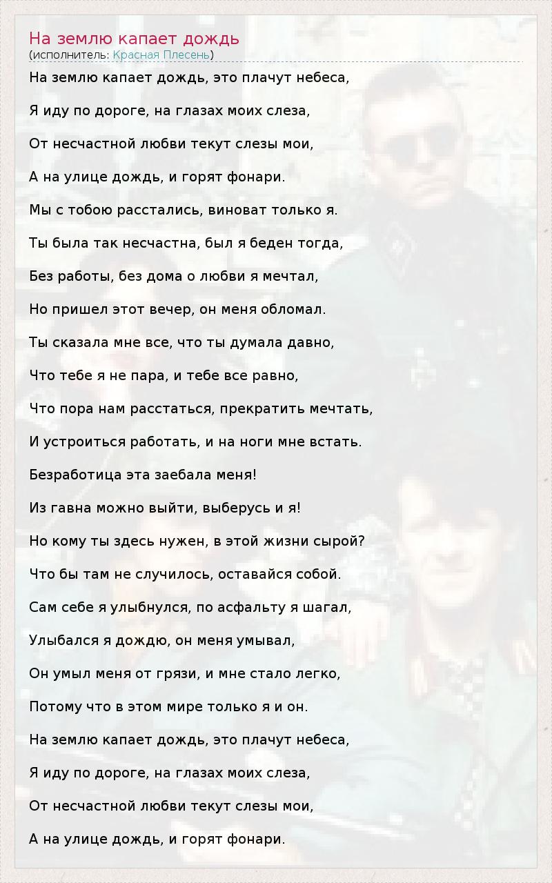 На землю капает дождь, это плачут небеса, Я иду по дороге, на глазах моих слеза, От несчастной любви текут слезы мои, А на улице дождь, и горят фонари. Мы с тобою расстались, виноват только я. Ты была так несчастна, был я беден тогда, Без работы, без дома о любви я мечтал, Но пришел этот вечер, он меня обломал. Ты сказала мне все, что ты думала давно, Что тебе я не пара, и тебе все равно, Что пора нам расстаться, прекратить мечтать, И устроиться работать, и на ноги мне встать. Безработица эта заебала меня! Из гавна можно выйти, выберусь и я! Но кому ты здесь нужен, в этой жизни сырой? Что бы там не случилось, оставайся собой. Сам себе я улыбнулся, по асфальту я шагал, Улыбался я дождю, он меня умывал, Он умыл меня от грязи, и мне стало легко, Потому что в этом мире только я и он. На землю капает дождь, это плачут небеса, Я иду по дороге, на глазах моих слеза, От несчастной любви текут слезы мои, А на улице дождь, и горят фонари.