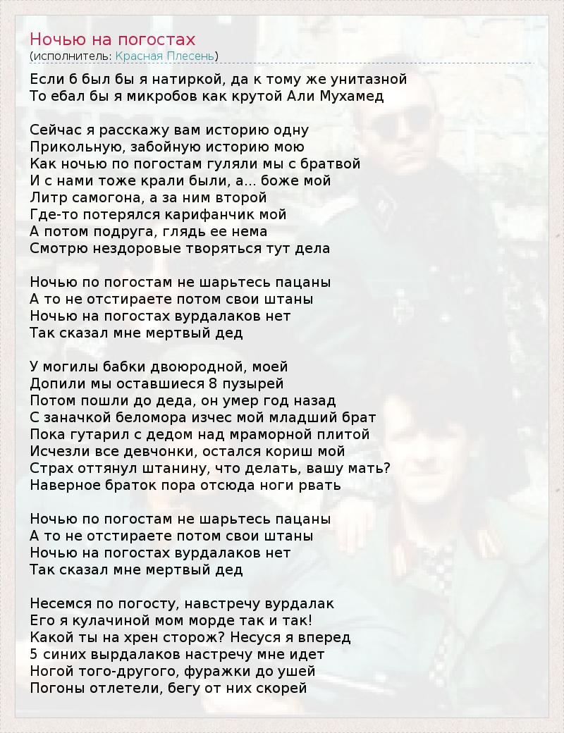 Если б был бы я натиркой, да к тому же унитазной То ебал бы я микробов как крутой Али Мухамед Сейчас я расскажу вам историю одну Прикольную, забойную историю мою Как ночью по погостам гуляли мы с братвой И с нами тоже крали были, а... боже мой Литр самогона, а за ним второй Где-то потерялся карифанчик мой А потом подруга, глядь ее нема Смотрю нездоровые творяться тут дела Ночью по погостам не шарьтесь пацаны А то не отстираете потом свои штаны Ночью на погостах вурдалаков нет Так сказал мне мертвый дед У могилы бабки двоюродной, моей Допили мы оставшиеся 8 пузырей Потом пошли до деда, он умер год назад С заначкой беломора изчес мой младший брат Пока гутарил с дедом над мраморной плитой Исчезли все девчонки, остался кориш мой Страх оттянул штанину, что делать, вашу мать? Наверное браток пора отсюда ноги рвать Ночью по погостам не шарьтесь пацаны А то не отстираете потом свои штаны Ночью на погостах вурдалаков нет Так сказал мне мертвый дед Несемся по погосту, навстречу вурдалак Его я кулачиной мом морде так и так! Какой ты на хрен сторож? Несуся я вперед 5 синих вырдалаков настречу мне идет Ногой того-другого, фуражки до ушей Погоны отлетели, бегу от них скорей
