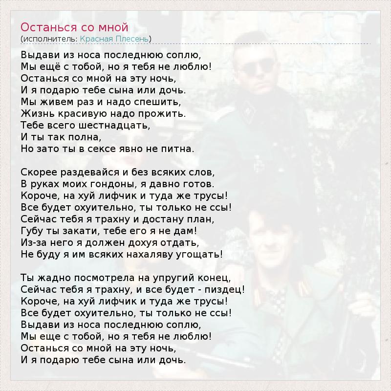 Выдави из носа последнюю соплю, Мы ещё с тобой, но я тебя не люблю! Останься со мной на эту ночь, И я подарю тебе сына или дочь. Мы живем раз и надо спешить, Жизнь красивую надо прожить. Тебе всего шестнадцать, И ты так полна, Но зато ты в сексе явно не питна. Скорее раздевайся и без всяких слов, В руках моих гондоны, я давно готов. Короче, на хуй лифчик и туда же трусы! Все будет охуительно, ты только не ссы! Сейчас тебя я трахну и достану план, Губу ты закати, тебе его я не дам! Из-за него я должен дохуя отдать, Не буду я им всяких нахаляву угощать! Ты жадно посмотрела на упругий конец, Сейчас тебя я трахну, и все будет - пиздец! Короче, на хуй лифчик и туда же трусы! Все будет охуительно, ты только не ссы! Выдави из носа последнюю соплю, Мы еще с тобой, но я тебя не люблю! Останься со мной на эту ночь, И я подарю тебе сына или дочь.