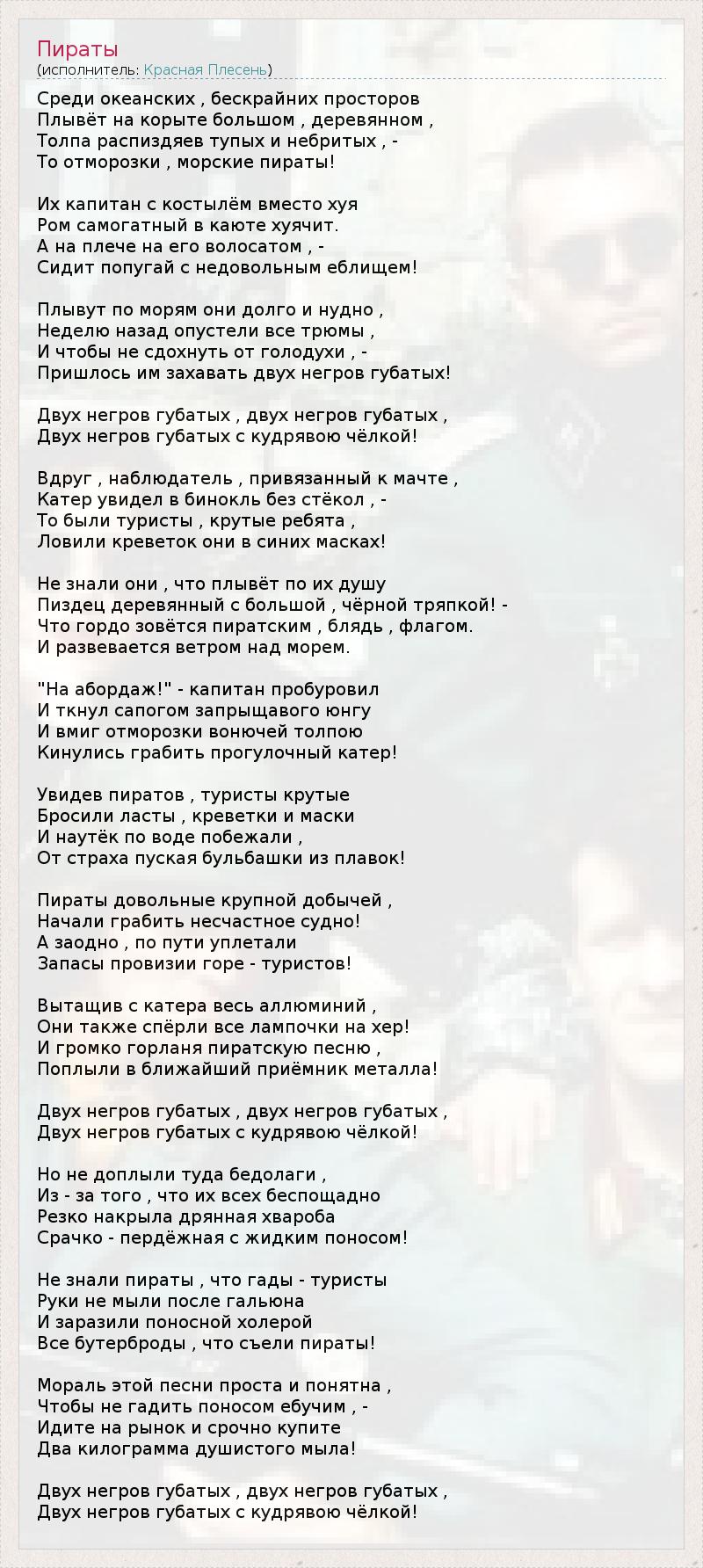 Среди океанских , бескрайних просторов Плывёт на корыте большом , деревянном , Толпа распиздяев тупых и небритых , - То отморозки , морские пираты! Их капитан с костылём вместо хуя Ром самогатный в каюте хуячит. А на плече на его волосатом , - Сидит попугай с недовольным еблищем! Плывут по морям они долго и нудно , Неделю назад опустели все трюмы , И чтобы не сдохнуть от голодухи , - Пришлось им захавать двух негров губатых! Двух негров губатых , двух негров губатых , Двух негров губатых с кудрявою чёлкой! Вдруг , наблюдатель , привязанный к мачте , Катер увидел в бинокль без стёкол , - То были туристы , крутые ребята , Ловили креветок они в синих масках! Не знали они , что плывёт по их душу Пиздец деревянный с большой , чёрной тряпкой! - Что гордо зовётся пиратским , блядь , флагом. И развевается ветром над морем. "На абордаж!" - капитан пробуровил И ткнул сапогом запрыщавого юнгу И вмиг отморозки вонючей толпою Кинулись грабить прогулочный катер! Увидев пиратов , туристы крутые Бросили ласты , креветки и маски И наутёк по воде побежали , От страха пуская бульбашки из плавок! Пираты довольные крупной добычей , Начали грабить несчастное судно! А заодно , по пути уплетали Запасы провизии горе - туристов! Вытащив с катера весь аллюминий , Они также спёрли все лампочки на хер! И громко горланя пиратскую песню , Поплыли в ближайший приёмник металла! Двух негров губатых , двух негров губатых , Двух негров губатых с кудрявою чёлкой! Но не доплыли туда бедолаги , Из - за того , что их всех беспощадно Резко накрыла дрянная хвароба Срачко - пердёжная с жидким поносом! Не знали пираты , что гады - туристы Руки не мыли после гальюна И заразили поносной холерой Все бутерброды , что съели пираты! Мораль этой песни проста и понятна , Чтобы не гадить поносом ебучим , - Идите на рынок и срочно купите Два килограмма душистого мыла! Двух негров губатых , двух негров губатых , Двух негров губатых с кудрявою чёлкой!