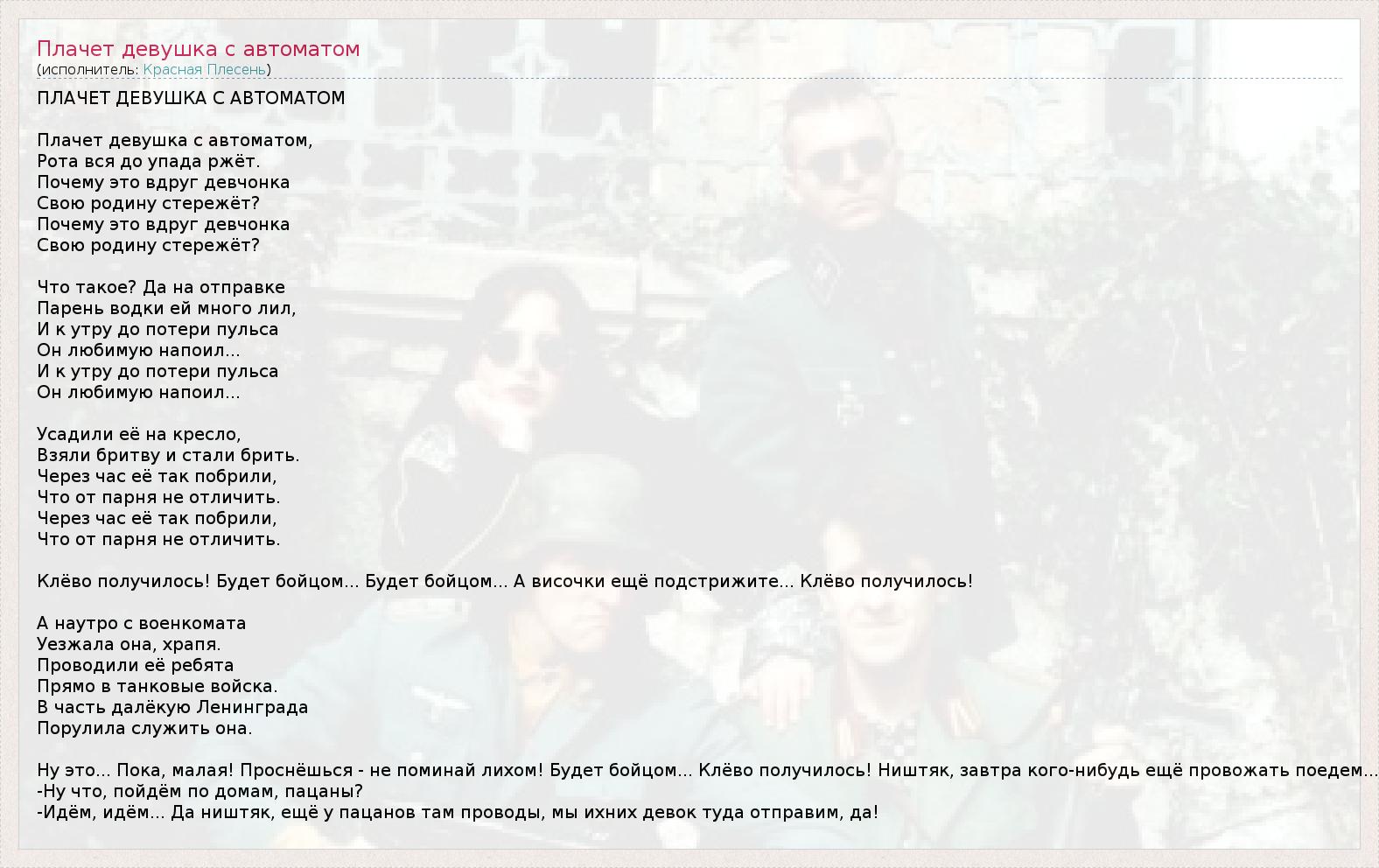 ПЛАЧЕТ ДЕВУШКА С АВТОМАТОМ Плачет девушка с автоматом, Рота вся до упада ржёт. Почему это вдруг девчонка Свою родину стережёт? Почему это вдруг девчонка Свою родину стережёт? Что такое? Да на отправке Парень водки ей много лил, И к утру до потери пульса Он любимую напоил... И к утру до потери пульса Он любимую напоил... Усадили её на кресло, Взяли бритву и стали брить. Через час её так побрили, Что от парня не отличить. Через час её так побрили, Что от парня не отличить. Клёво получилось! Будет бойцом... Будет бойцом... А височки ещё подстрижите... Клёво получилось! А наутро с военкомата Уезжала она, храпя. Проводили её ребята Прямо в танковые войска. В часть далёкую Ленинграда Порулила служить она. Ну это... Пока, малая! Проснёшься - не поминай лихом! Будет бойцом... Клёво получилось! Ништяк, завтра кого-нибудь ещё провожать поедем... -Ну что, пойдём по домам, пацаны? -Идём, идём... Да ништяк, ещё у пацанов там проводы, мы ихних девок туда отправим, да!