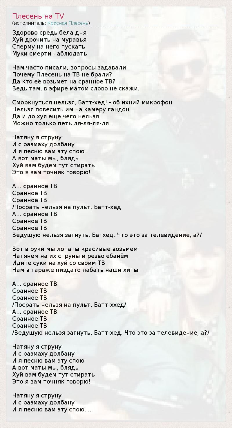 Здорово средь бела дня Хуй дрочить на муравья Сперму на него пускать Муки смерти наблюдать Нам часто писали, вопросы задавали Почему Плесень на ТВ не брали? Да кто её возьмет на сранное ТВ? Ведь там, в эфире матом слово не скажи. Сморкнуться нельзя, Батт-хед! - об ихний микрофон Нельзя повесить им на камеру гандон Да и до хуя еще чего нельзя Можно только петь ля-ля-ля-ля... Натяну я струну И с размаху долбану И я песню вам эту спою А вот маты мы, блядь Хуй вам будем тут стирать Это я вам точняк говорю! А... сранное ТВ Сранное ТВ Сранное ТВ /Посрать нельзя на пульт, Батт-хед А... сранное ТВ Сранное ТВ Сранное ТВ Ведущую нельзя загнуть, Батхед. Что это за телевидение, а?/ Вот в руки мы лопаты красивые возьмем Натянем на их струны и резво ебанём Идите суки на хуй со своим ТВ Нам в гараже пиздато лабать наши хиты А... сранное ТВ Сранное ТВ Сранное ТВ /Посрать нельзя на пульт, Батт-ххед/ А... сранное ТВ Сранное ТВ Сранное ТВ /Ведущую нельзя загнуть, Батт-хед. Что это за телевидение, а?/ Натяну я струну И с размаху долбану И я песню вам эту спою А вот маты мы, блядь Хуй вам будем тут стирать Это я вам точняк говорю! Натяну я струну И с размаху долбану И я песню вам эту спою....