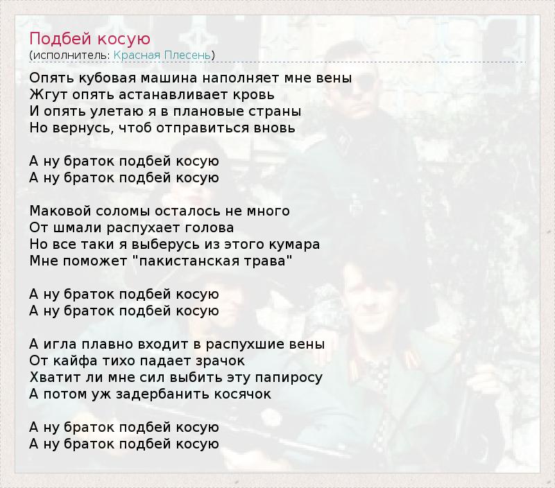 Опять кубовая машина наполняет мне вены Жгут опять астанавливает кровь И опять улетаю я в плановые страны Но вернусь, чтоб отправиться вновь А ну браток подбей косую А ну браток подбей косую Маковой соломы осталось не много От шмали распухает голова Но все таки я выберусь из этого кумара Мне поможет "пакистанская трава" А ну браток подбей косую А ну браток подбей косую А игла плавно входит в распухшие вены От кайфа тихо падает зрачок Хватит ли мне сил выбить эту папиросу А потом уж задербанить косячок А ну браток подбей косую А ну браток подбей косую