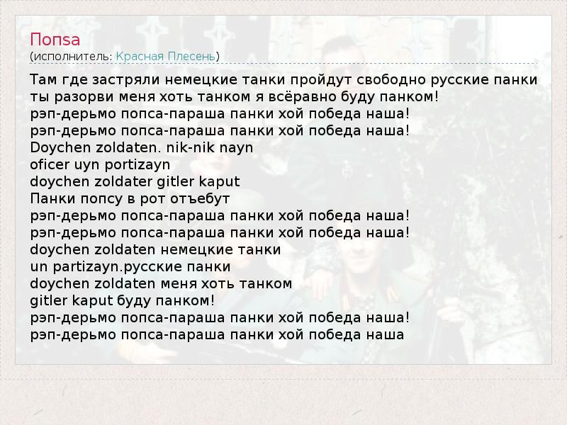 Там где застряли немецкие танки пройдут свободно русские панки ты разорви меня хоть танком я всёравно буду панком! рэп-дерьмо попса-параша панки хой победа наша! рэп-дерьмо попса-параша панки хой победа наша! Doychen zoldaten. nik-nik nayn oficer uyn portizayn doychen zoldater gitler kaput Панки попсу в рот отъебут рэп-дерьмо попса-параша панки хой победа наша! рэп-дерьмо попса-параша панки хой победа наша! doychen zoldaten немецкие танки un partizayn.русские панки doychen zoldaten меня хоть танком gitler kaput буду панком! рэп-дерьмо попса-параша панки хой победа наша! рэп-дерьмо попса-параша панки хой победа наша