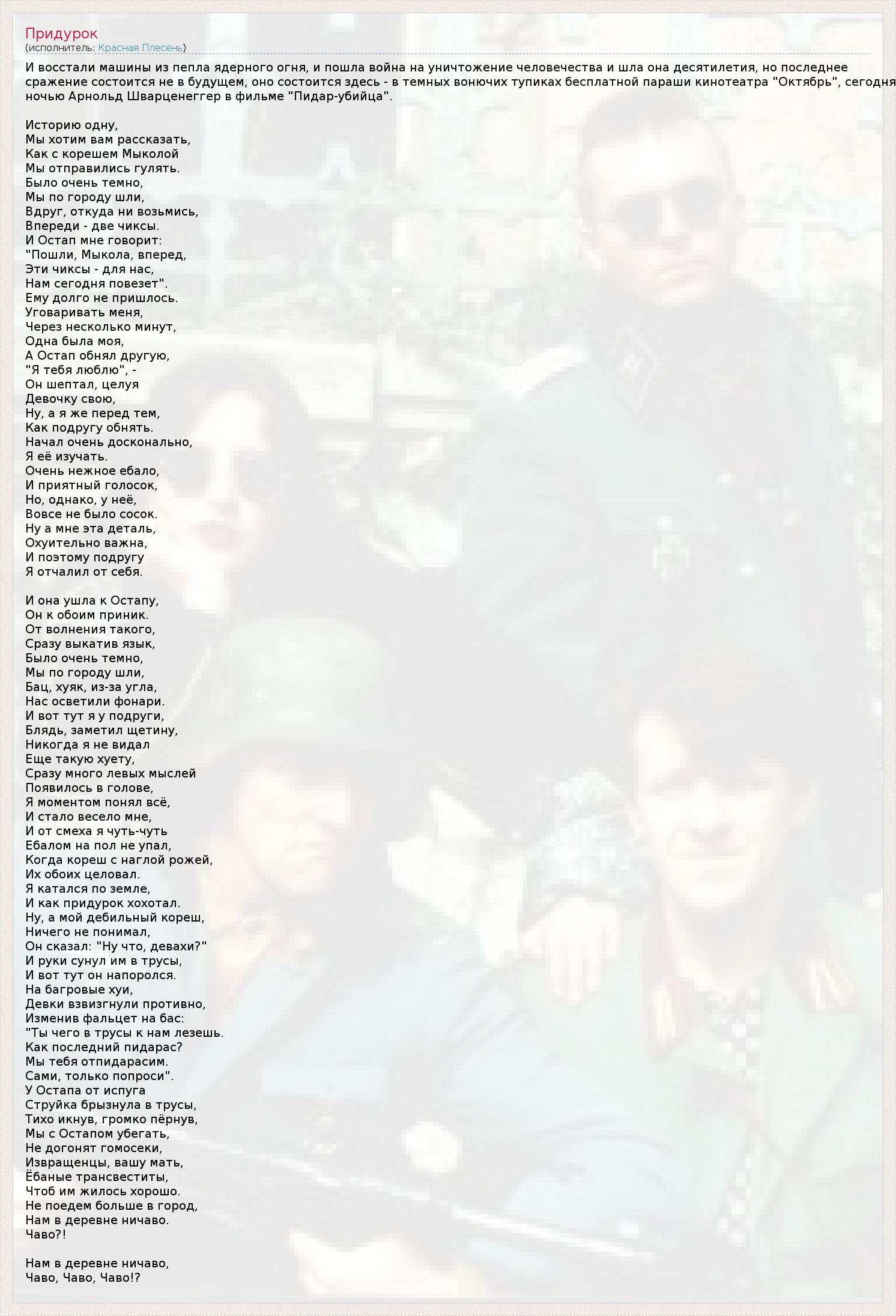 И восстали машины из пепла ядерного огня, и пошла война на уничтожение человечества и шла она десятилетия, но последнее сражение состоится не в будущем, оно состоится здесь - в темных вонючих тупиках бесплатной параши кинотеатра "Октябрь", сегодня ночью Арнольд Шварценеггер в фильме "Пидар-убийца". Историю одну, Мы хотим вам рассказать, Как с корешем Мыколой Мы отправились гулять. Было очень темно, Мы по городу шли, Вдруг, откуда ни возьмись, Впереди - две чиксы. И Остап мне говорит: "Пошли, Мыкола, вперед, Эти чиксы - для нас, Нам сегодня повезет". Ему долго не пришлось. Уговаривать меня, Через несколько минут, Одна была моя, А Остап обнял другую, "Я тебя люблю", - Он шептал, целуя Девочку свою, Ну, а я же перед тем, Как подругу обнять. Начал очень досконально, Я её изучать. Очень нежное ебало, И приятный голосок, Но, однако, у неё, Вовсе не было сосок. Ну а мне эта деталь, Охуительно важна, И поэтому подругу Я отчалил от себя. И она ушла к Остапу, Он к обоим приник. От волнения такого, Сразу выкатив язык, Было очень темно, Мы по городу шли, Бац, хуяк, из-за угла, Нас осветили фонари. И вот тут я у подруги, Блядь, заметил щетину, Никогда я не видал Еще такую хуету, Сразу много левых мыслей Появилось в голове, Я моментом понял всё, И стало весело мне, И от смеха я чуть-чуть Ебалом на пол не упал, Когда кореш с наглой рожей, Их обоих целовал. Я катался по земле, И как придурок хохотал. Ну, а мой дебильный кореш, Ничего не понимал, Он сказал: "Ну что, девахи?" И руки сунул им в трусы, И вот тут он напоролся. На багровые хуи, Девки взвизгнули противно, Изменив фальцет на бас: "Ты чего в трусы к нам лезешь. Как последний пидарас? Мы тебя отпидарасим. Сами, только попроси". У Остапа от испуга Струйка брызнула в трусы, Тихо икнув, громко пёрнув, Мы с Остапом убегать, Не догонят гомосеки, Извращенцы, вашу мать, Ёбаные трансвеститы, Чтоб им жилось хорошо. Не поедем больше в город, Нам в деревне ничаво. Чаво?! Нам в деревне ничаво, Чаво, Чаво, Чаво!?