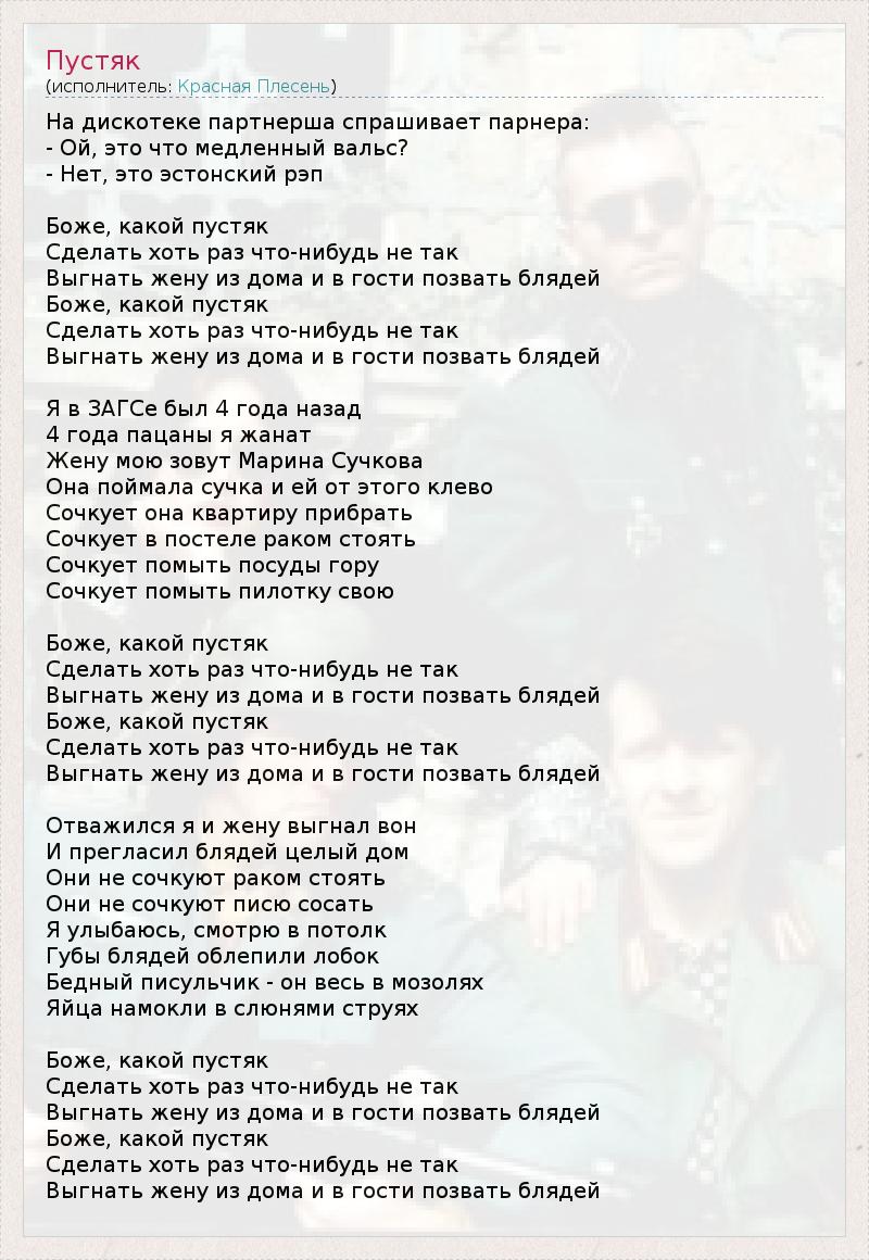 На дискотеке партнерша спрашивает парнера: - Ой, это что медленный вальс? - Нет, это эстонский рэп Боже, какой пустяк Сделать хоть раз что-нибудь не так Выгнать жену из дома и в гости позвать блядей Боже, какой пустяк Сделать хоть раз что-нибудь не так Выгнать жену из дома и в гости позвать блядей Я в ЗАГСе был 4 года назад 4 года пацаны я жанат Жену мою зовут Марина Сучкова Она поймала сучка и ей от этого клево Сочкует она квартиру прибрать Сочкует в постеле раком стоять Сочкует помыть посуды гору Сочкует помыть пилотку свою Боже, какой пустяк Сделать хоть раз что-нибудь не так Выгнать жену из дома и в гости позвать блядей Боже, какой пустяк Сделать хоть раз что-нибудь не так Выгнать жену из дома и в гости позвать блядей Отважился я и жену выгнал вон И прегласил блядей целый дом Они не сочкуют раком стоять Они не сочкуют писю сосать Я улыбаюсь, смотрю в потолк Губы блядей облепили лобок Бедный писульчик - он весь в мозолях Яйца намокли в слюнями струях Боже, какой пустяк Сделать хоть раз что-нибудь не так Выгнать жену из дома и в гости позвать блядей Боже, какой пустяк Сделать хоть раз что-нибудь не так Выгнать жену из дома и в гости позвать блядей