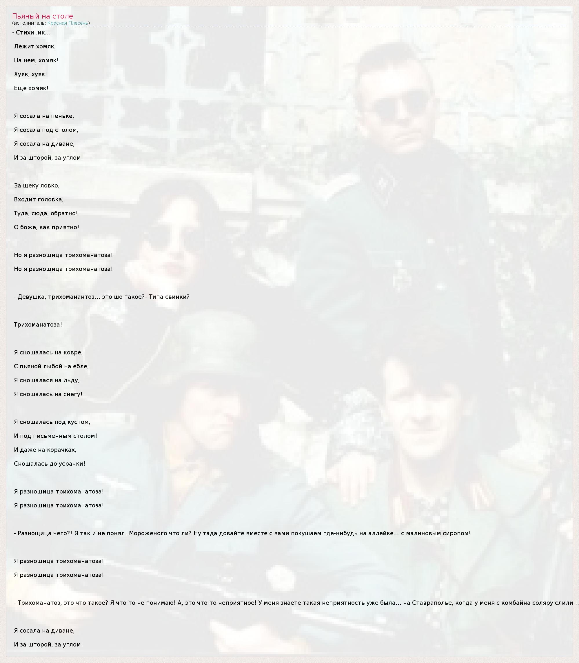 - Стихи..ик… Лежит хомяк, На нем, хомяк! Хуяк, хуяк! Еще хомяк! Я сосала на пеньке, Я сосала под столом, Я сосала на диване, И за шторой, за углом! За щеку ловко, Входит головка, Туда, сюда, обратно! О боже, как приятно! Но я разнощица трихоманатоза! Но я разнощица трихоманатоза! - Девушка, трихоманантоз… это шо такое?! Типа свинки? Трихоманатоза! Я сношалась на ковре, С пьяной лыбой на ебле, Я сношалася на льду, Я сношалась на снегу! Я сношалась под кустом, И под письменным столом! И даже на корачках, Сношалась до усрачки! Я разнощица трихоманатоза! Я разнощица трихоманатоза! - Разнощица чего?! Я так и не понял! Мороженого что ли? Ну тада довайте вместе с вами покушаем где-нибудь на аллейке… с малиновым сиропом! Я разнощица трихоманатоза! Я разнощица трихоманатоза! - Трихоманатоз, это что такое? Я что-то не понимаю! А, это что-то неприятное! У меня знаете такая неприятность уже была… на Ставраполье, когда у меня с комбайна соляру слили… Я сосала на диване, И за шторой, за углом!