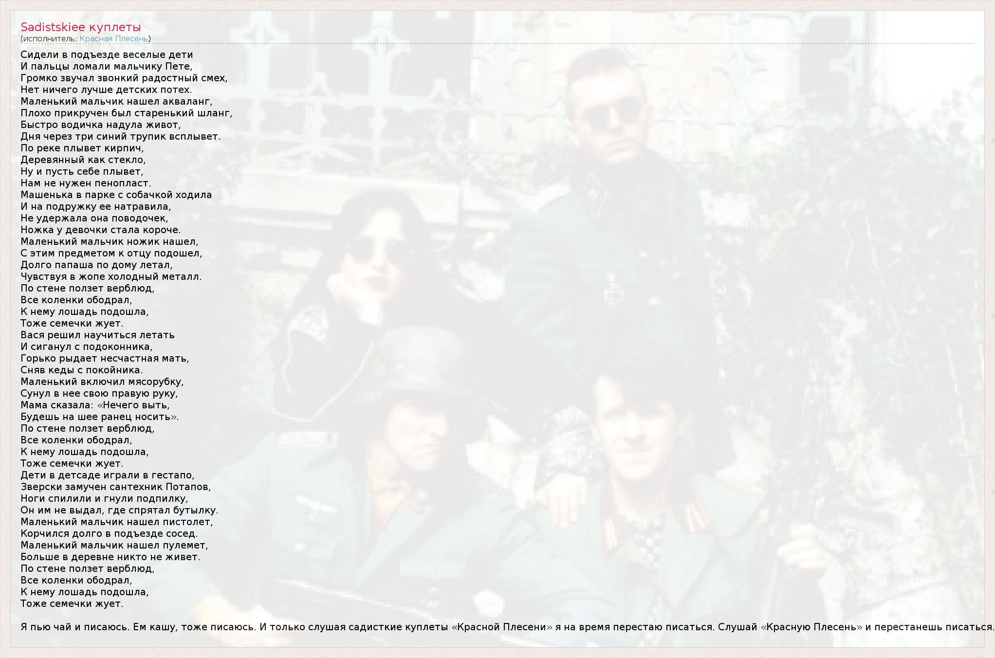 Я пью чай и писаюсь. Ем кашу, тоже писаюсь. И только слушая садисткие куплеты «Красной Плесени» я на время перестаю писаться. Слушай «Красную Плесень» и перестанешь писаться.