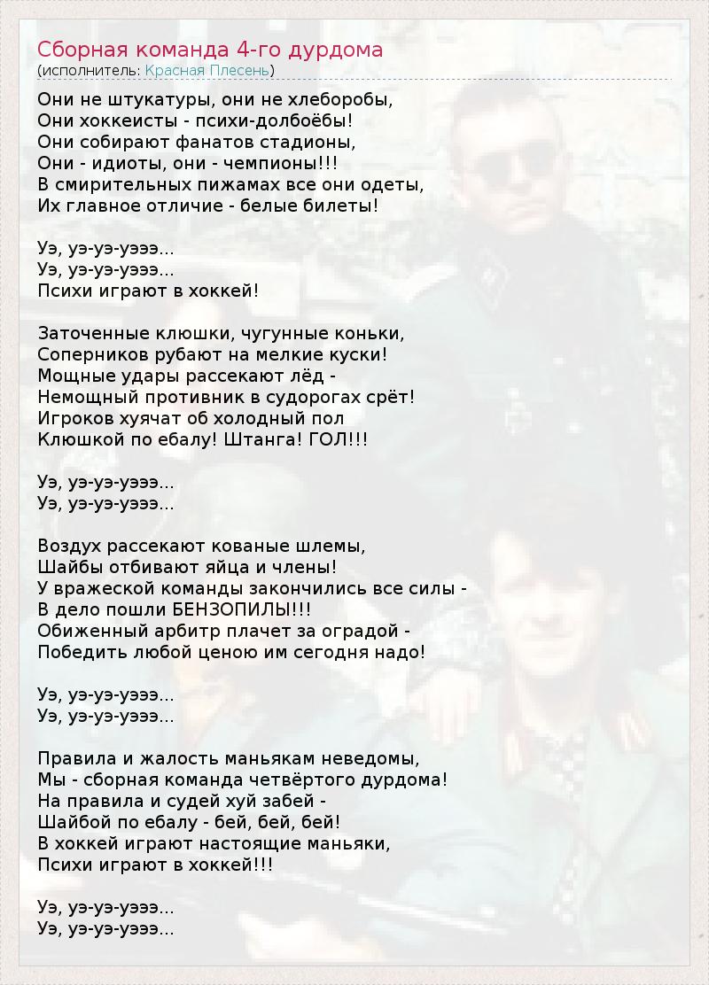 Они не штукатуры, они не хлеборобы, Они хоккеисты - психи-долбоёбы! Они собирают фанатов стадионы, Они - идиоты, они - чемпионы!!! В смирительных пижамах все они одеты, Их главное отличие - белые билеты! Уэ, уэ-уэ-уэээ... Уэ, уэ-уэ-уэээ... Психи играют в хоккей! Заточенные клюшки, чугунные коньки, Соперников рубают на мелкие куски! Мощные удары рассекают лёд - Немощный противник в судорогах срёт! Игроков хуячат об холодный пол Клюшкой по ебалу! Штанга! ГОЛ!!! Уэ, уэ-уэ-уэээ... Уэ, уэ-уэ-уэээ... Воздух рассекают кованые шлемы, Шайбы отбивают яйца и члены! У вражеской команды закончились все силы - В дело пошли БЕНЗОПИЛЫ!!! Обиженный арбитр плачет за оградой - Победить любой ценою им сегодня надо! Уэ, уэ-уэ-уэээ... Уэ, уэ-уэ-уэээ... Правила и жалость маньякам неведомы, Мы - сборная команда четвёртого дурдома! На правила и судей хуй забей - Шайбой по ебалу - бей, бей, бей! В хоккей играют настоящие маньяки, Психи играют в хоккей!!! Уэ, уэ-уэ-уэээ... Уэ, уэ-уэ-уэээ...