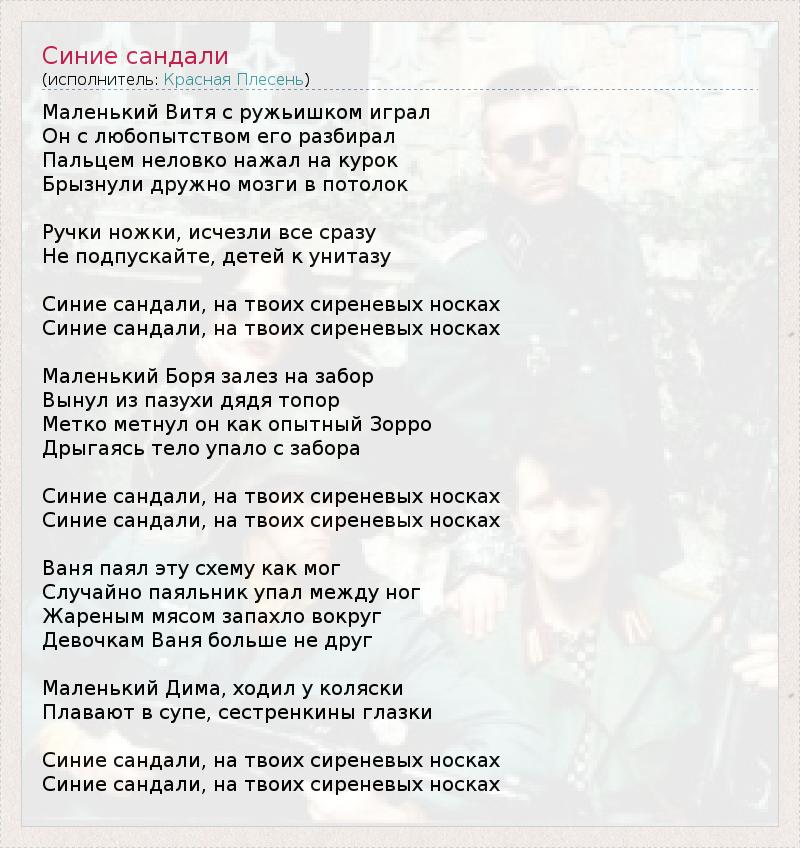 Маленький Витя с ружьишком играл Он с любопытством его разбирал Пальцем неловко нажал на курок Брызнули дружно мозги в потолок Ручки ножки, исчезли все сразу Не подпускайте, детей к унитазу Синие сандали, на твоих сиреневых носках Синие сандали, на твоих сиреневых носках Маленький Боря залез на забор Вынул из пазухи дядя топор Метко метнул он как опытный Зорро Дрыгаясь тело упало с забора Синие сандали, на твоих сиреневых носках Синие сандали, на твоих сиреневых носках Ваня паял эту схему как мог Случайно паяльник упал между ног Жареным мясом запахло вокруг Девочкам Ваня больше не друг Маленький Дима, ходил у коляски Плавают в супе, сестренкины глазки Синие сандали, на твоих сиреневых носках Синие сандали, на твоих сиреневых носках