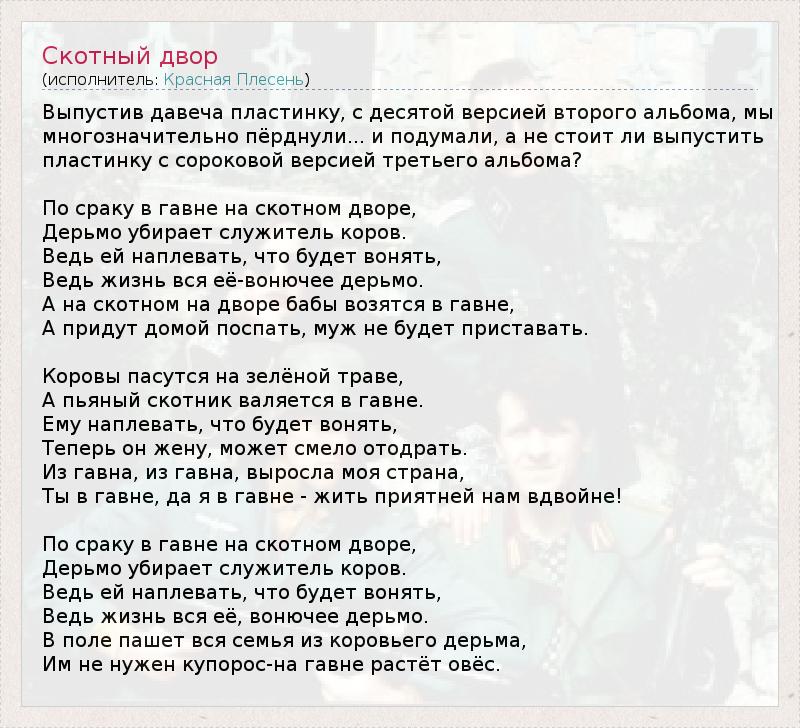 Это интересно:«Красная Плесень» — русская sovietcore группа из Симферополя, основанная Павлом Яцыной в 1989 году, которая известна пародированием известных песен российских и иностранных исполнителей и групп, а также исполнением собственных композиций . 15 альбомов из серии «СОЮЗ популярных пародий», 9 пародийных сказок и более двадцати песенных тяжелых sovietcore-альбомов и сборников.8 параллельных проектов.... продолжение