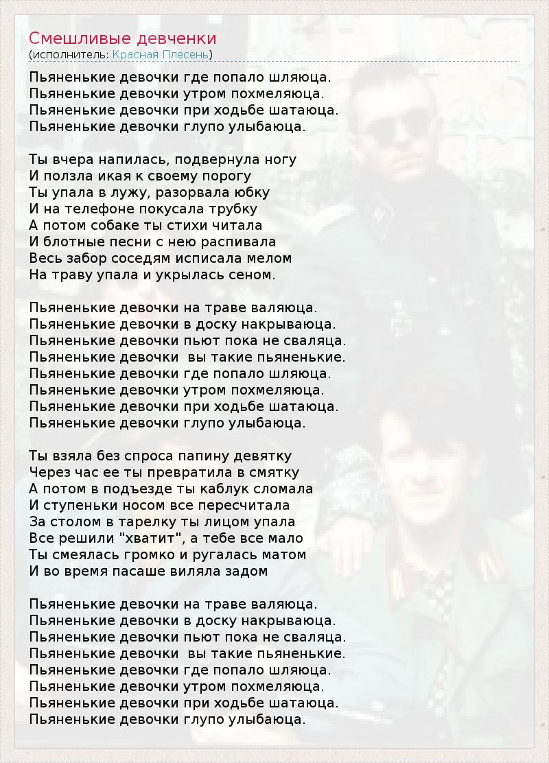 Пьяненькие девочки где попало шляюца. Пьяненькие девочки утром похмеляюца. Пьяненькие девочки при ходьбе шатаюца. Пьяненькие девочки глупо улыбаюца. Ты вчера напилась, подвернула ногу И ползла икая к своему порогу Ты упала в лужу, разорвала юбку И на телефоне покусала трубку А потом собаке ты стихи читала И блотные песни с нею распивала Весь забор соседям исписала мелом На траву упала и укрылась сеном. Пьяненькие девочки на траве валяюца. Пьяненькие девочки в доску накрываюца. Пьяненькие девочки пьют пока не сваляца. Пьяненькие девочки вы такие пьяненькие. Пьяненькие девочки где попало шляюца. Пьяненькие девочки утром похмеляюца. Пьяненькие девочки при ходьбе шатаюца. Пьяненькие девочки глупо улыбаюца. Ты взяла без спроса папину девятку Через час ее ты превратила в смятку А потом в подъезде ты каблук сломала И ступеньки носом все пересчитала За столом в тарелку ты лицом упала Все решили "хватит", а тебе все мало Ты смеялась громко и ругалась матом И во время пасаше виляла задом Пьяненькие девочки на траве валяюца. Пьяненькие девочки в доску накрываюца. Пьяненькие девочки пьют пока не сваляца. Пьяненькие девочки вы такие пьяненькие. Пьяненькие девочки где попало шляюца. Пьяненькие девочки утром похмеляюца. Пьяненькие девочки при ходьбе шатаюца. Пьяненькие девочки глупо улыбаюца.