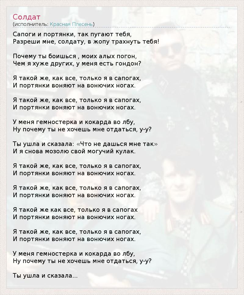 Это интересно:«Красная Плесень» — русская sovietcore группа из Симферополя, основанная Павлом Яцыной в 1989 году, которая известна пародированием известных песен российских и иностранных исполнителей и групп, а также исполнением собственных композиций . 15 альбомов из серии «СОЮЗ популярных пародий», 9 пародийных сказок и более двадцати песенных тяжелых sovietcore-альбомов и сборников.8 параллельных проектов.... продолжение