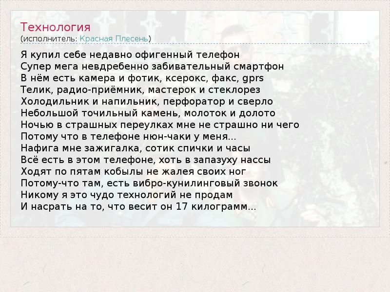 Я купил себе недавно офигенный телефон Супер мега невдребенно забивательный смартфон В нём есть камера и фотик, ксерокс, факс, gprs Телик, радио-приёмник, мастерок и стеклорез Холодильник и напильник, перфоратор и сверло Небольшой точильный камень, молоток и долото Ночью в страшных переулках мне не страшно ни чего Потому что в телефоне нюн-чаки у меня... Нафига мне зажигалка, сотик спички и часы Всё есть в этом телефоне, хоть в запазуху нассы Ходят по пятам кобылы не жалея своих ног Потому-что там, есть вибро-кунилинговый звонок Никому я это чудо технологий не продам И насрать на то, что весит он 17 килограмм...