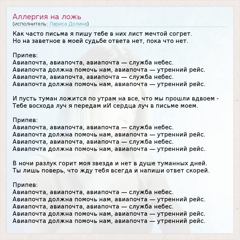 Как часто письма я пишу тебе в них лист мечтой согрет. Но на заветное в моей судьбе ответа нет, пока что нет. Припев: Авиапочта, авиапочта, авиапочта — служба небес. Авиапочта должна помочь нам, авиапочта — утренний рейс. Авиапочта, авиапочта, авиапочта — служба небес. Авиапочта должна помочь нам, авиапочта — утренний рейс. И пусть туман ложится по утрам на все, что мы прошли вдвоем - Тебе восхода луч я передам иИ сердца луч в письме моем. Припев: Авиапочта, авиапочта, авиапочта — служба небес. Авиапочта должна помочь нам, авиапочта — утренний рейс. Авиапочта, авиапочта, авиапочта — служба небес. Авиапочта должна помочь нам, авиапочта — утренний рейс. В ночи разлук горит моя звезда и нет в душе туманных дней. Ты лишь поверь, что жду тебя всегда и напиши ответ скорей. Припев: Авиапочта, авиапочта, авиапочта — служба небес. Авиапочта должна помочь нам, авиапочта — утренний рейс. Авиапочта, авиапочта, авиапочта — служба небес. Авиапочта должна помочь нам, авиапочта — утренний рейс. Авиапочта должна помочь нам, авиапочта — утренний рейс.