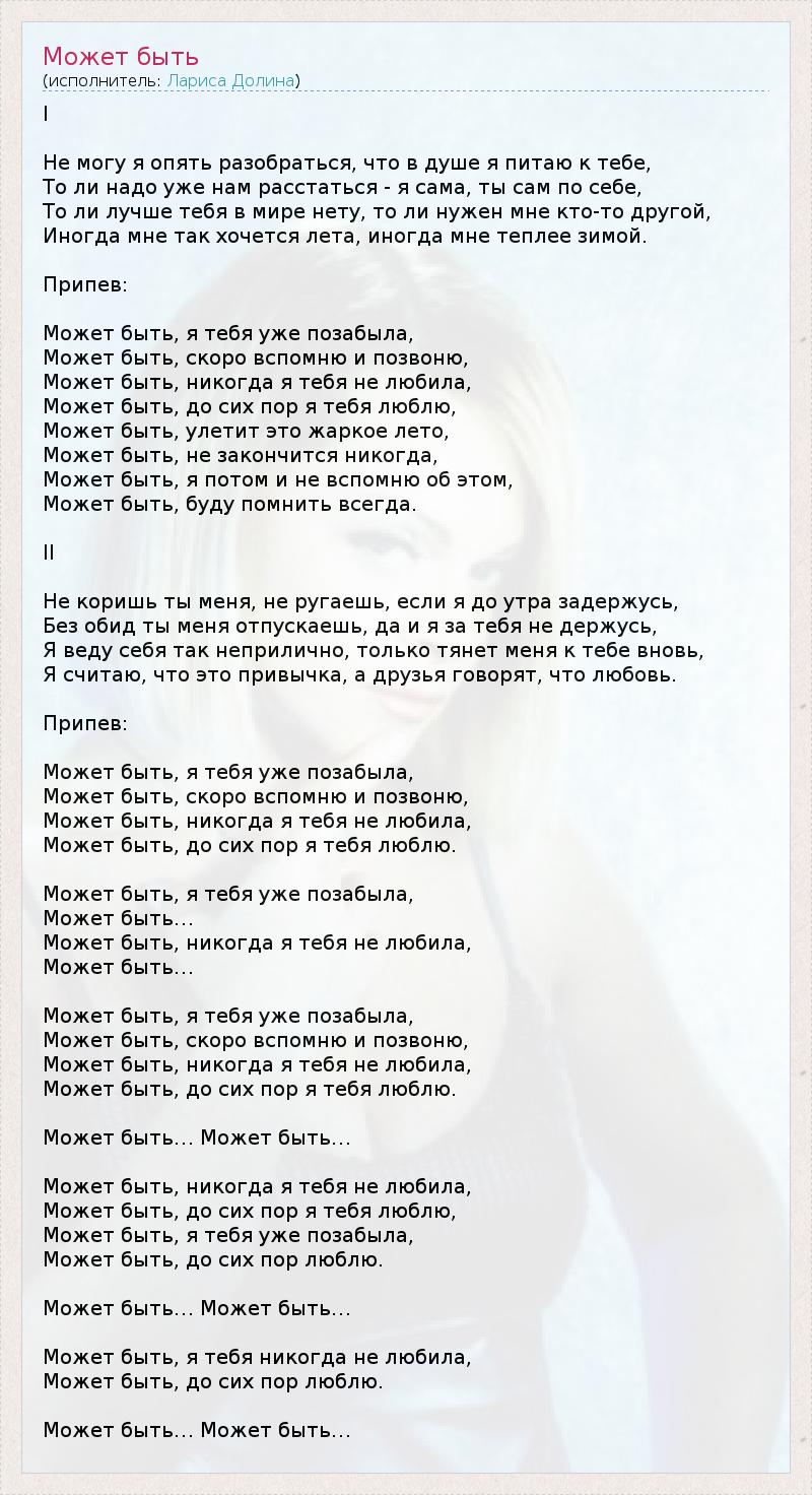 I Не могу я опять разобраться, что в душе я питаю к тебе, То ли надо уже нам расстаться - я сама, ты сам по себе, То ли лучше тебя в мире нету, то ли нужен мне кто-то другой, Иногда мне так хочется лета, иногда мне теплее зимой. Припев: Может быть, я тебя уже позабыла, Может быть, скоро вспомню и позвоню, Может быть, никогда я тебя не любила, Может быть, до сих пор я тебя люблю, Может быть, улетит это жаркое лето, Может быть, не закончится никогда, Может быть, я потом и не вспомню об этом, Может быть, буду помнить всегда. II Не коришь ты меня, не ругаешь, если я до утра задержусь, Без обид ты меня отпускаешь, да и я за тебя не держусь, Я веду себя так неприлично, только тянет меня к тебе вновь, Я считаю, что это привычка, а друзья говорят, что любовь. Припев: Может быть, я тебя уже позабыла, Может быть, скоро вспомню и позвоню, Может быть, никогда я тебя не любила, Может быть, до сих пор я тебя люблю. Может быть, я тебя уже позабыла, Может быть… Может быть, никогда я тебя не любила, Может быть… Может быть, я тебя уже позабыла, Может быть, скоро вспомню и позвоню, Может быть, никогда я тебя не любила, Может быть, до сих пор я тебя люблю. Может быть… Может быть… Может быть, никогда я тебя не любила, Может быть, до сих пор я тебя люблю, Может быть, я тебя уже позабыла, Может быть, до сих пор люблю. Может быть… Может быть… Может быть, я тебя никогда не любила, Может быть, до сих пор люблю. Может быть… Может быть…