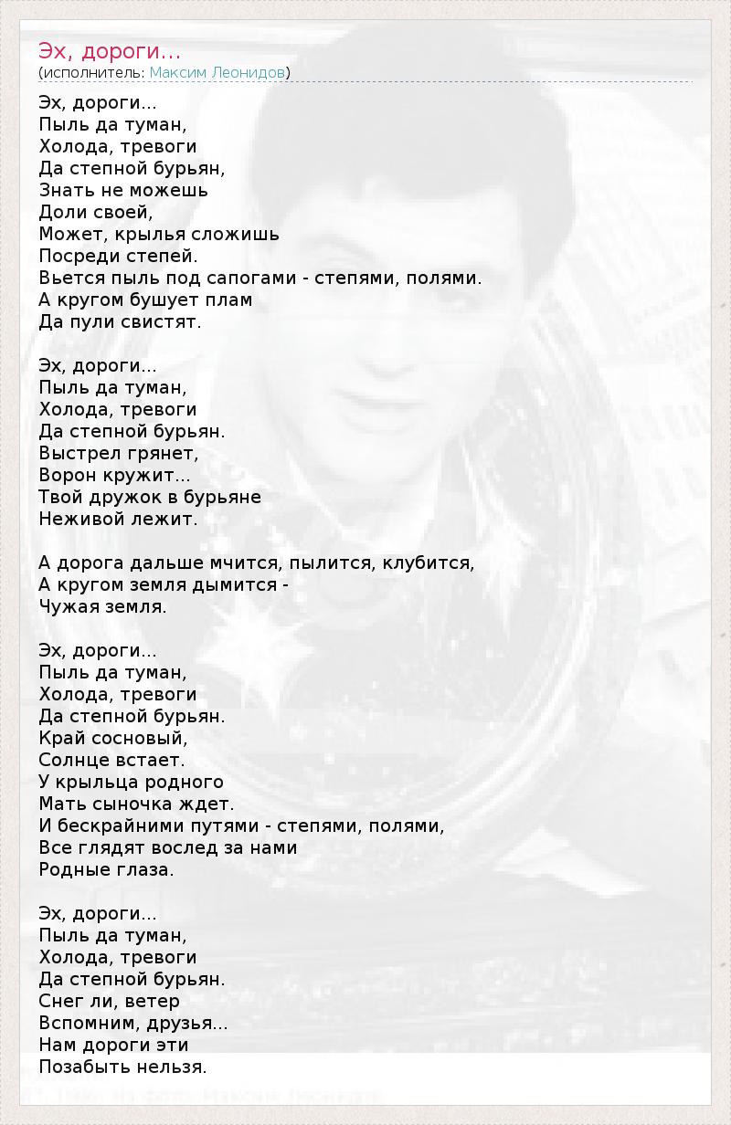 Эх, дороги... Пыль да туман, Холода, тревоги Да степной бурьян, Знать не можешь Доли своей, Может, крылья сложишь Посреди степей. Вьется пыль под сапогами - степями, полями. А кругом бушует плам Да пули свистят. Эх, дороги... Пыль да туман, Холода, тревоги Да степной бурьян. Выстрел грянет, Ворон кружит... Твой дружок в бурьяне Неживой лежит. А дорога дальше мчится, пылится, клубится, А кругом земля дымится - Чужая земля. Эх, дороги... Пыль да туман, Холода, тревоги Да степной бурьян. Край сосновый, Солнце встает. У крыльца родного Мать сыночка ждет. И бескрайними путями - степями, полями, Все глядят вослед за нами Родные глаза. Эх, дороги... Пыль да туман, Холода, тревоги Да степной бурьян. Снег ли, ветер Вспомним, друзья... Нам дороги эти Позабыть нельзя.