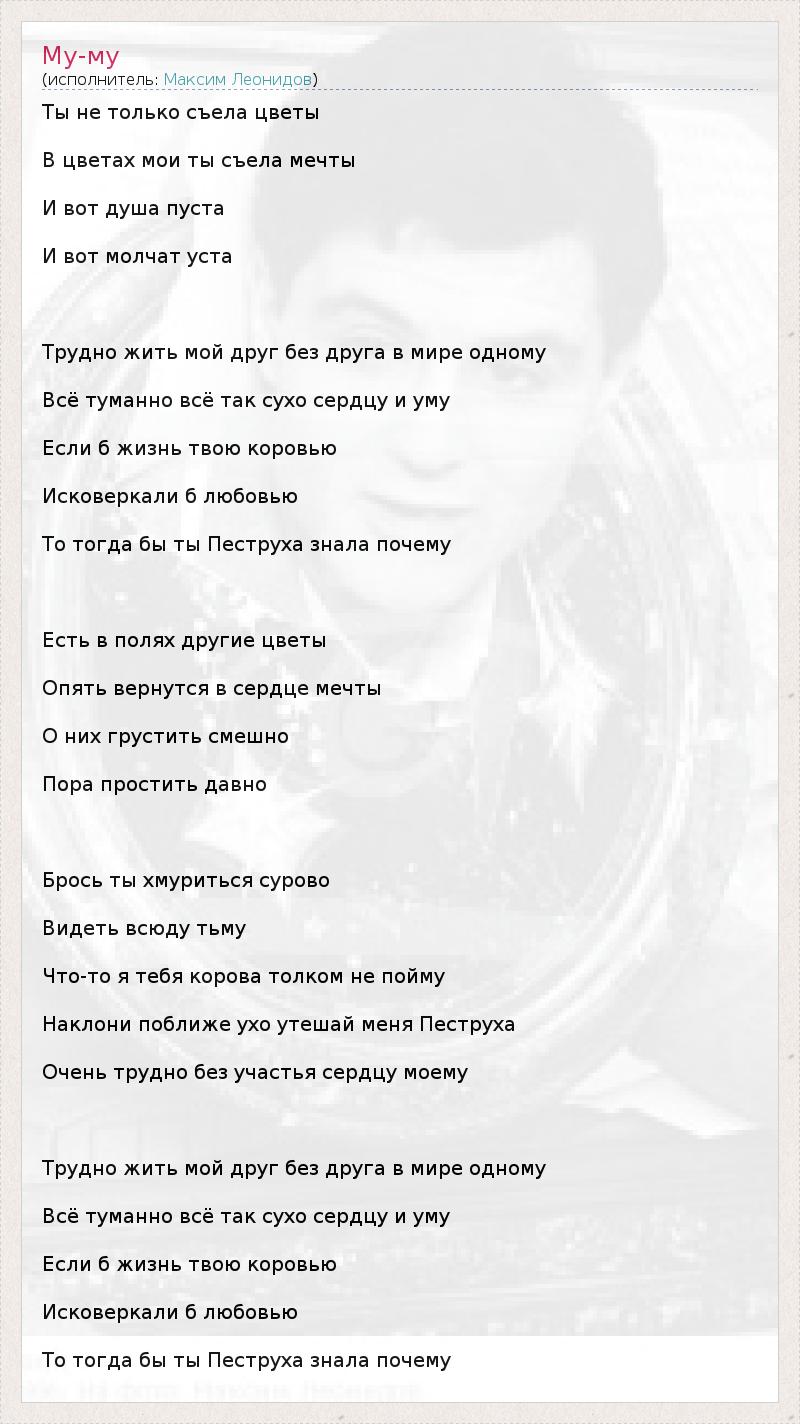 Ты не только съела цветы В цветах мои ты съела мечты И вот душа пуста И вот молчат уста Трудно жить мой друг без друга в мире одному Всё туманно всё так сухо сердцу и уму Если б жизнь твою коровью Исковеркали б любовью То тогда бы ты Пеструха знала почему Есть в полях другие цветы Опять вернутся в сердце мечты О них грустить смешно Пора простить давно Брось ты хмуриться сурово Видеть всюду тьму Что-то я тебя корова толком не пойму Наклони поближе ухо утешай меня Пеструха Очень трудно без участья сердцу моему Трудно жить мой друг без друга в мире одному Всё туманно всё так сухо сердцу и уму Если б жизнь твою коровью Исковеркали б любовью То тогда бы ты Пеструха знала почему