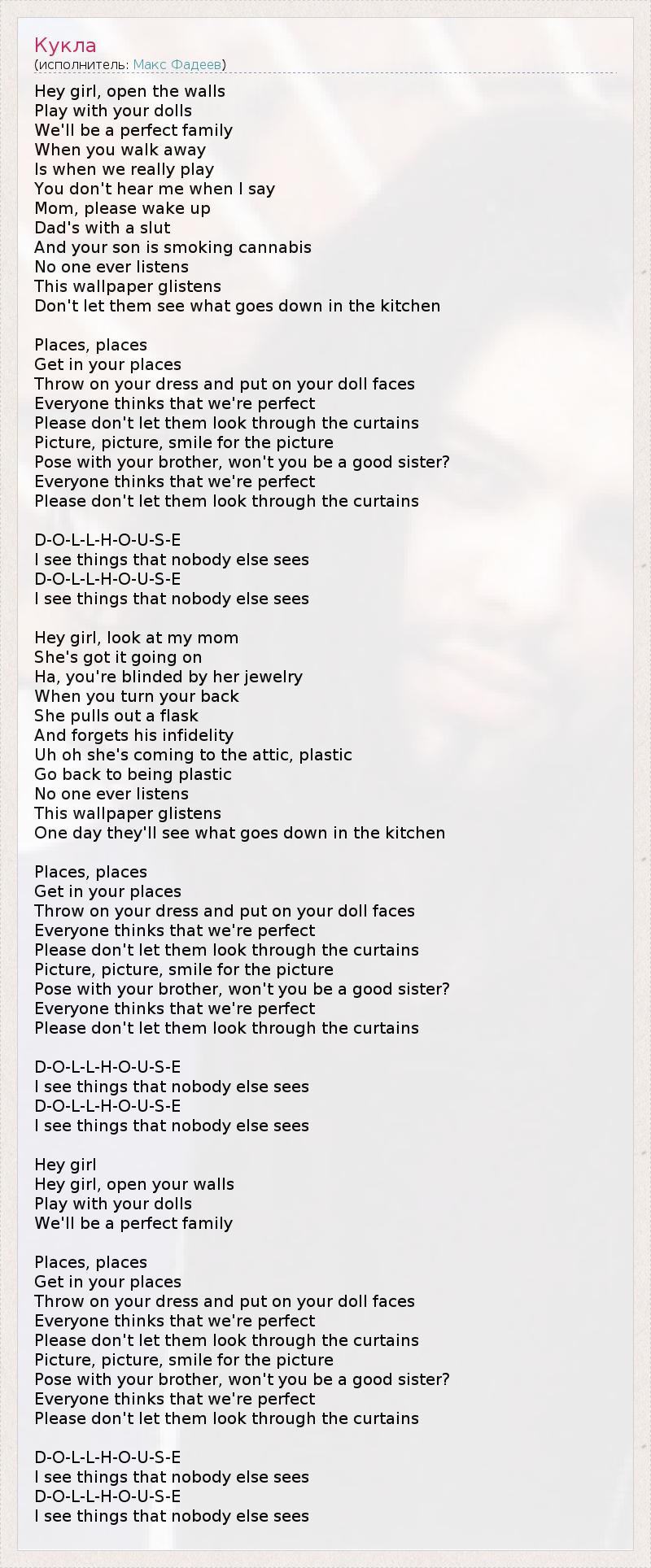 Эй, девочка, раздвинь стенки, Поиграй со своими куклами, Мы будем идеальной семьей. Когда ты уходишь, Тогда мы начинаем настоящую игру, Ты не слышишь меня, когда я говорю... Мама, прошу, проснись, Папа со шл*хой, А твой сынок курит марихуану. Никто никого не слушает. Эти обои блестят. Не позволяй никому увидеть то, что происходит на кухне... Места, места, Займите свои места, Натягивай платье и сделай кукольное личико, Все считают нас идеальными, Прошу, не позволяй им заглянуть за шторы. Фото, фото, улыбнись для фото, Попозируй с братом, разве ты не хорошая сестричка? Всем кажется, что мы идеальны, Прошу, только не позволяй им заглянуть за шторы... К-У-К-О-Л-Ь-Н-Ы-Й-Д-О-М-И-К, Я вижу то, чего больше никто не видит, К-У-К-О-Л-Ь-Н-Ы-Й-Д-О-М-И-К, Я вижу то, чего больше никто не видит... Эй, девочка, посмотри на мою маму, Она кажется шикарной, Ха, тебя ослепили ее драгоценности, Стоит тебе отвернуться, Как она вытаскивает фляжку, Чтобы забыть о его изменах. Ой-ой, она идет на чердак, ненастоящей, Она снова становится ненастоящей. Никто никого не слушает, Эти обои блестят. Однажды все увидят то, что происходит на кухне... Места, места, Займите свои места, Натягивай платье и сделай кукольное личико, Все считают нас идеальными, Прошу, не позволяй им заглянуть за шторы. Фото, фото, улыбнись для фото, Попозируй с братом, разве ты не хорошая сестричка? Всем кажется, что мы идеальны, Прошу, только не позволяй им заглянуть за шторы... К-У-К-О-Л-Ь-Н-Ы-Й-Д-О-М-И-К, Я вижу то, чего больше никто не видит, К-У-К-О-Л-Ь-Н-Ы-Й-Д-О-М-И-К, Я вижу то, чего больше никто не видит... Эй, девочка, Эй, девочка, раздвинь стенки, Поиграй со своими куклами, Мы будем идеальной семьей... Места, места, Займите свои места, Натягивай платье и сделай кукольное личико, Все считают нас идеальными, Прошу, не позволяй им заглянуть за шторы. Фото, фото, улыбнись для фото, Попозируй с братом, разве ты не хорошая сестричка? Всем кажется, что мы идеальны, Прошу, только не позволяй им заглянуть за шторы... К-У-К-О-Л-Ь-Н-Ы-Й-Д-О-М-И-К, Я вижу то, чего больше никто не видит, К-У-К-О-Л-Ь-Н-Ы-Й-Д-О-М-И-К, Я вижу то, чего больше никто не видит...