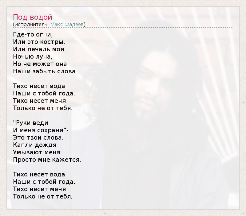 Где-то огни, Или это костры, Или печаль моя. Ночью луна, Но не может она Наши забыть слова. Тихо несет вода Наши с тобой года. Тихо несет меня Только не от тебя. "Руки веди И меня сохрани"- Это твои слова. Капли дождя Умывают меня. Просто мне кажется. Тихо несет вода Наши с тобой года. Тихо несет меня Только не от тебя.