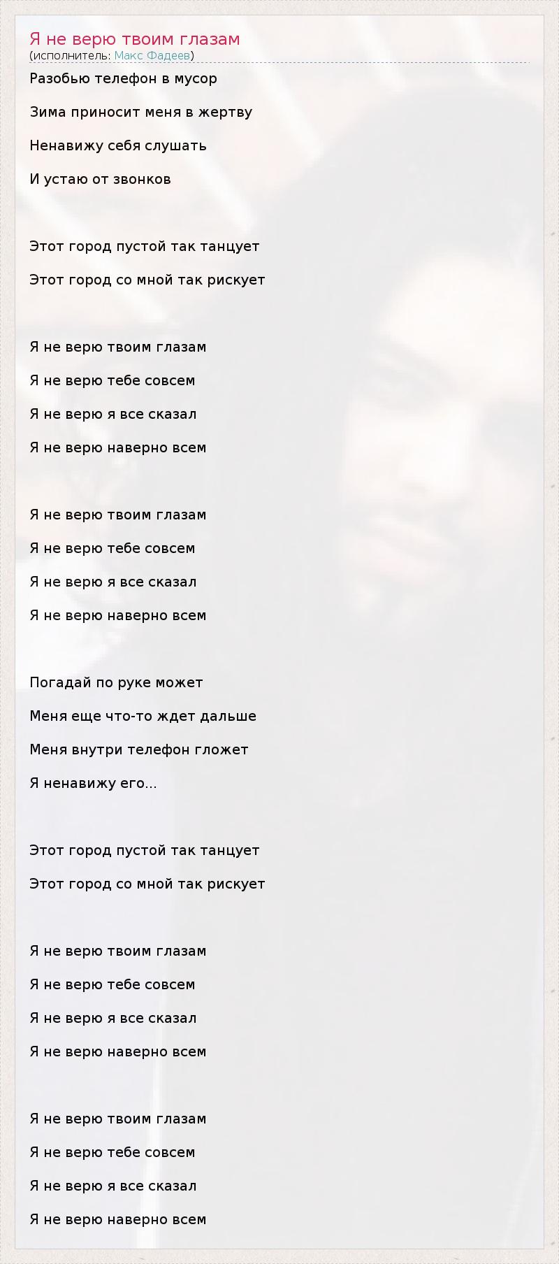 Разобью телефон в мусор Зима приносит меня в жертву Ненавижу себя слушать И устаю от звонков Этот город пустой так танцует Этот город со мной так рискует Я не верю твоим глазам Я не верю тебе совсем Я не верю я все сказал Я не верю наверно всем Я не верю твоим глазам Я не верю тебе совсем Я не верю я все сказал Я не верю наверно всем Погадай по руке может Меня еще что-то ждет дальше Меня внутри телефон гложет Я ненавижу его... Этот город пустой так танцует Этот город со мной так рискует Я не верю твоим глазам Я не верю тебе совсем Я не верю я все сказал Я не верю наверно всем Я не верю твоим глазам Я не верю тебе совсем Я не верю я все сказал Я не верю наверно всем