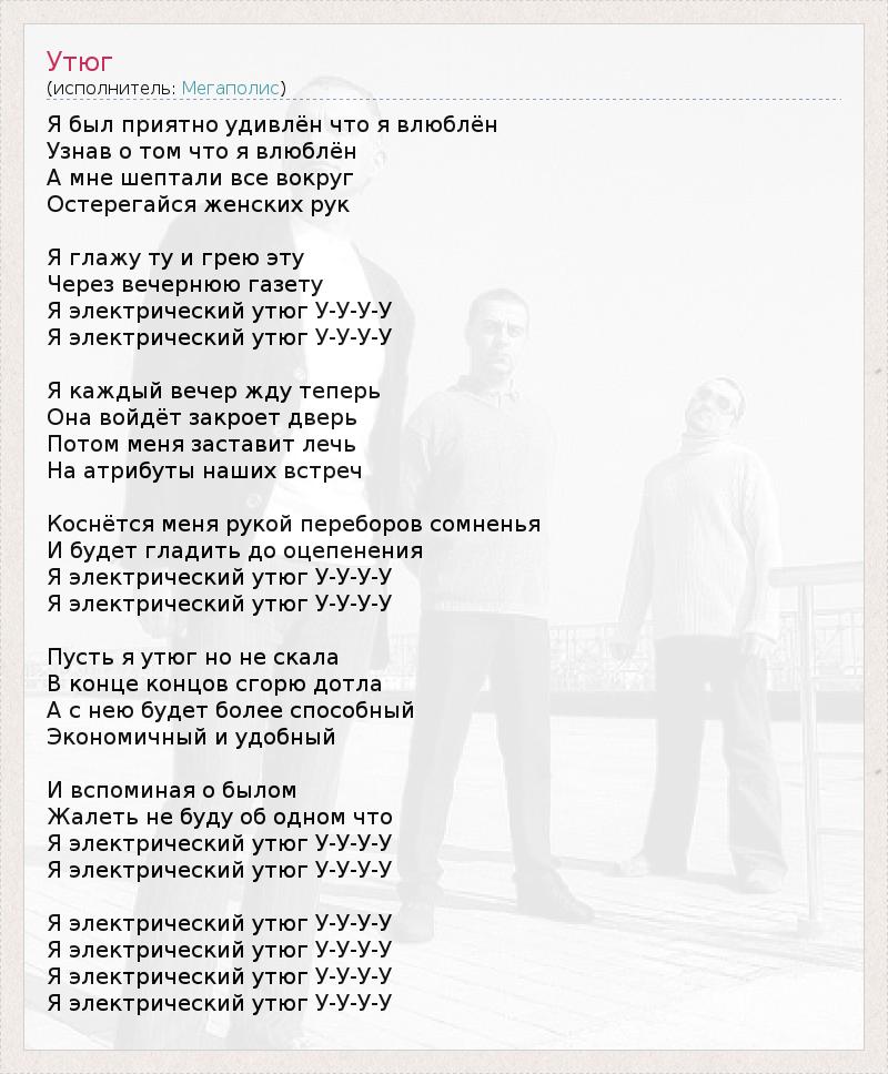 Я был приятно удивлён что я влюблён Узнав о том что я влюблён А мне шептали все вокруг Остерегайся женских рук Я глажу ту и грею эту Через вечернюю газету Я электрический утюг У-У-У-У Я электрический утюг У-У-У-У Я каждый вечер жду теперь Она войдёт закроет дверь Потом меня заставит лечь На атрибуты наших встреч Коснётся меня рукой переборов сомненья И будет гладить до оцепенения Я электрический утюг У-У-У-У Я электрический утюг У-У-У-У Пусть я утюг но не скала В конце концов сгорю дотла А с нею будет более способный Экономичный и удобный И вспоминая о былом Жалеть не буду об одном что Я электрический утюг У-У-У-У Я электрический утюг У-У-У-У Я электрический утюг У-У-У-У Я электрический утюг У-У-У-У Я электрический утюг У-У-У-У Я электрический утюг У-У-У-У