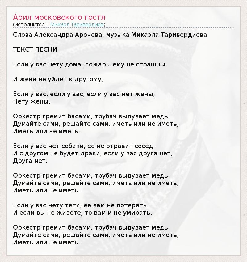 Слова Александра Аронова, музыка Микаэла Таривердиева ТЕКСТ ПЕСНИ Если у вас нету дома, пожары ему не страшны. И жена не уйдет к другому, Если у вас, если у вас, если у вас нет жены, Нету жены. Оркестр гремит басами, трубач выдувает медь. Думайте сами, решайте сами, иметь или не иметь, Иметь или не иметь. Если у вас нет собаки, ее не отравит сосед. И с другом не будет драки, если у вас друга нет, Друга нет. Оркестр гремит басами, трубач выдувает медь. Думайте сами, решайте сами, иметь или не иметь, Иметь или не иметь. Если у вас нету тёти, ее вам не потерять. И если вы не живете, то вам и не умирать. Оркестр гремит басами, трубач выдувает медь. Думайте сами, решайте сами, иметь или не иметь, Иметь или не иметь.