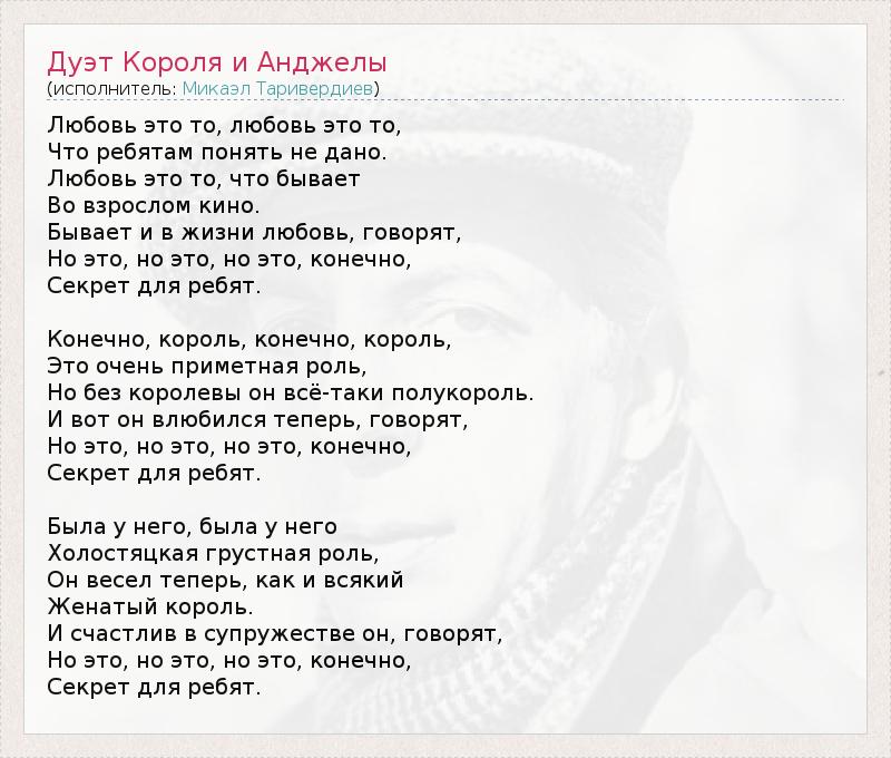 Любовь это то, любовь это то, Что ребятам понять не дано. Любовь это то, что бывает Во взрослом кино. Бывает и в жизни любовь, говорят, Но это, но это, но это, конечно, Секрет для ребят. Конечно, король, конечно, король, Это очень приметная роль, Но без королевы он всё-таки полукороль. И вот он влюбился теперь, говорят, Но это, но это, но это, конечно, Секрет для ребят. Была у него, была у него Холостяцкая грустная роль, Он весел теперь, как и всякий Женатый король. И счастлив в супружестве он, говорят, Но это, но это, но это, конечно, Секрет для ребят.